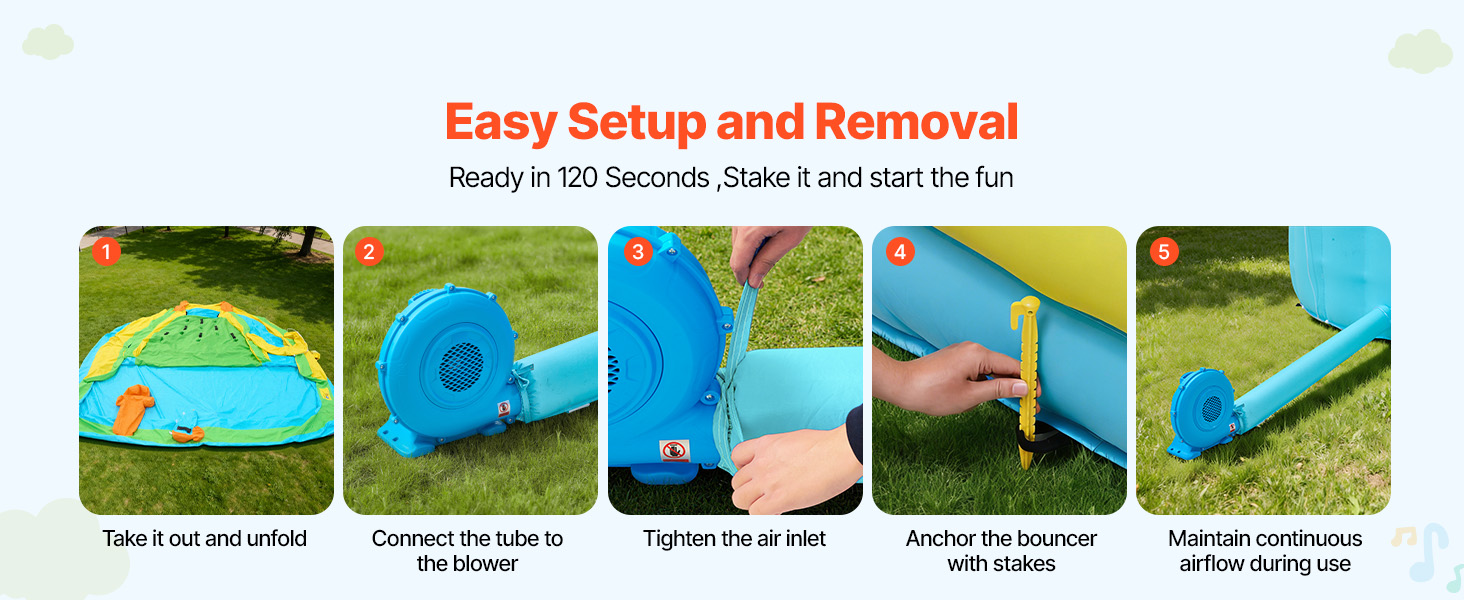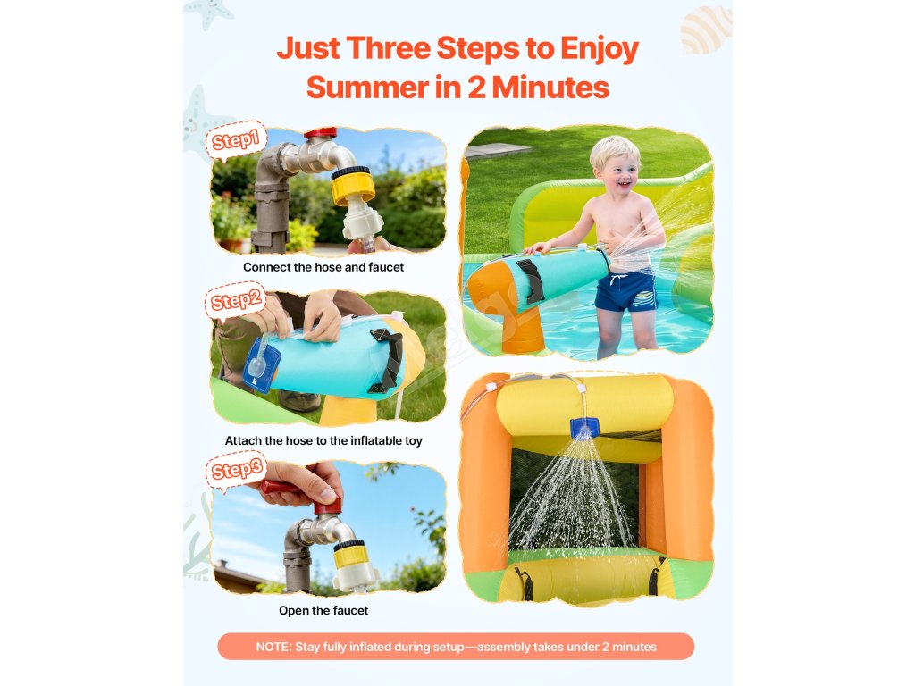 Náš nafukovací vodný hrad sa ľahko inštaluje a odstraňuje a nafúknutie trvá len dve minúty. Pred použitím je potrebné skontrolovať, či na zemi nie sú ostré predmety. Na skladovanie vypnite ventilátor, zrolujte ho a vložte do tašky na prenášanie. Bezšvové opravné náplasti umožňujú jednoduché opravy.