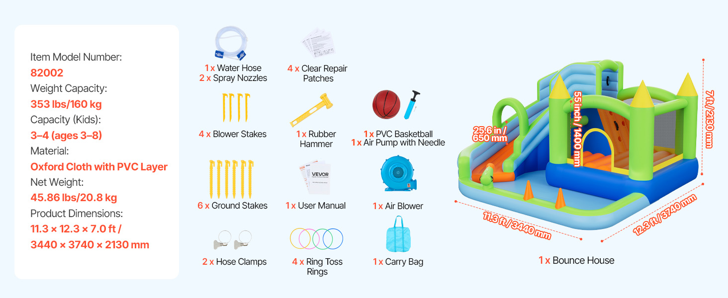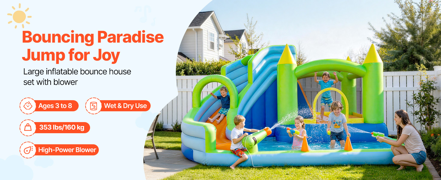 Náš nafukovací skákací hrad na suché aj mokré použitie je ideálny na narodeniny, letné posedenia a každodennú zábavu na dvore. Ponúka skákacie plochy, bazénik a mnoho ďalšieho. Je vyrobený z hrubého materiálu Oxford 840D+420D a má zosilnené dvojité švy. Je vybavený sieťkou po celom obvode, ktorá zaisťuje dobrú viditeľnosť.