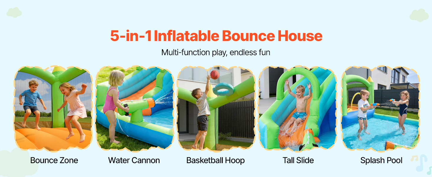 Tento nafukovací hrad s veľkou skákacou plochou a hladkou šmýkačkou ponúka deťom a rodinám viacero spôsobov, ako si užiť spoločnú zábavu. Inovatívna hra s hádzaním vodných krúžkov pridáva interaktívnu zábavu, vďaka čomu si deti môžu užiť hravé chvíle a skupinové aktivity s priateľmi počas hry vonku.