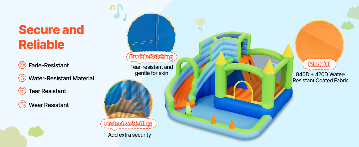 Tento detský nafukovací vodný park VEVOR kombinuje podšívku 190T s odolnou odrazovou zónou 840D, aby podporil pevný celkový tvar. Kľúčové namáhané oblasti využívajú technológiu dvojitého šitia na zlepšenie pevnosti švov, čo pomáha znížiť otvory a riziko pádu detí z bokov pri skákaní.