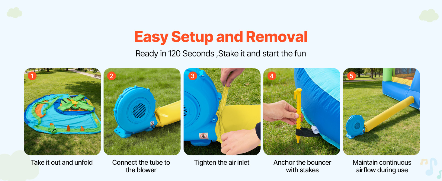 Náš nafukovací vodný hrad sa ľahko inštaluje a odstraňuje a nafúknutie trvá len dve minúty. Pred použitím je potrebné skontrolovať, či na zemi nie sú ostré predmety. Na skladovanie vypnite ventilátor, zrolujte ho a vložte do tašky na prenášanie. Bezšvové opravné náplasti umožňujú jednoduché opravy.