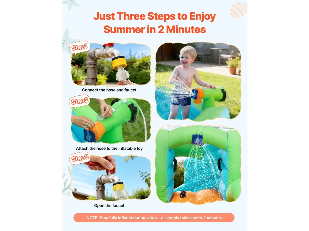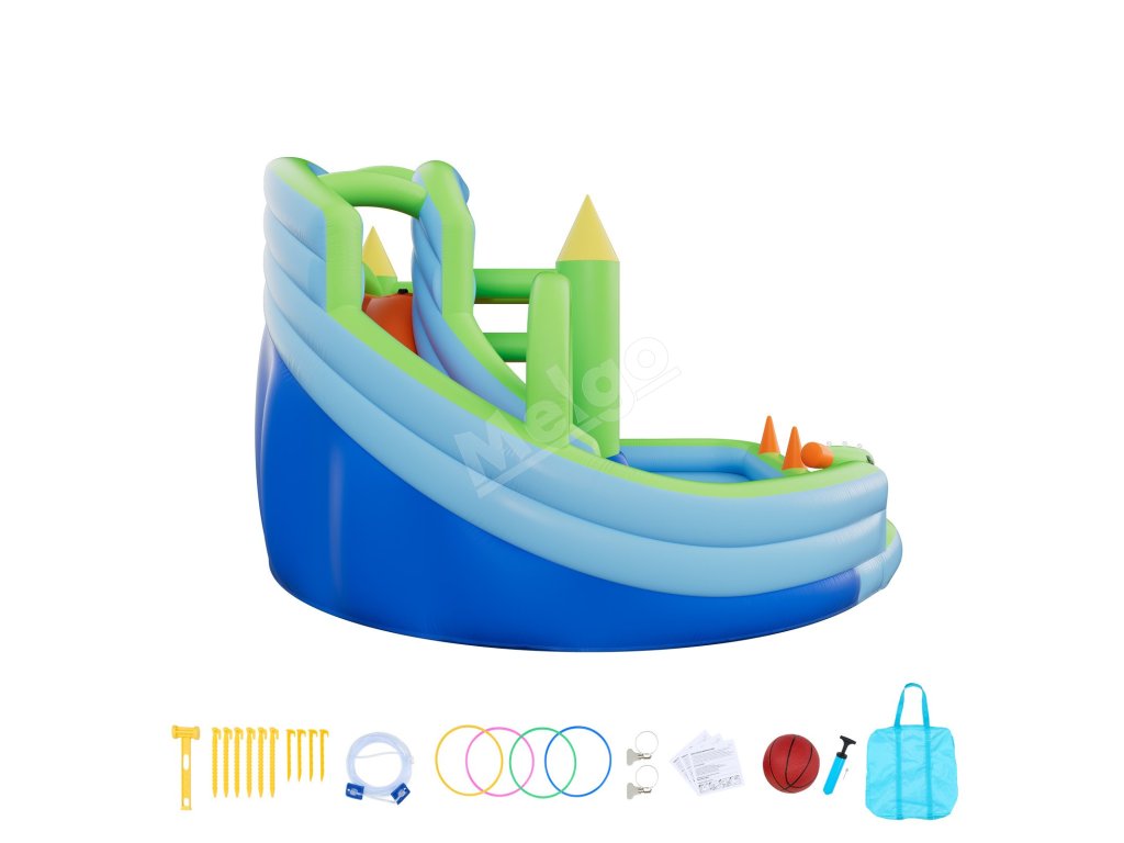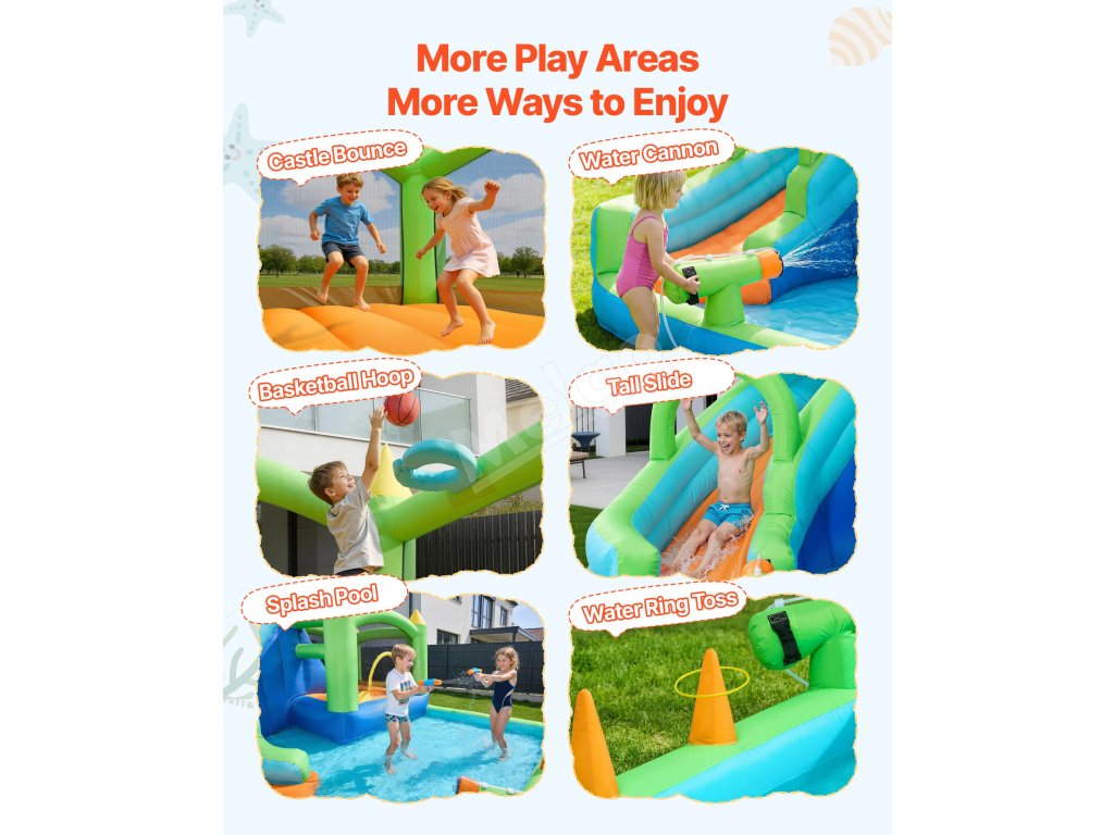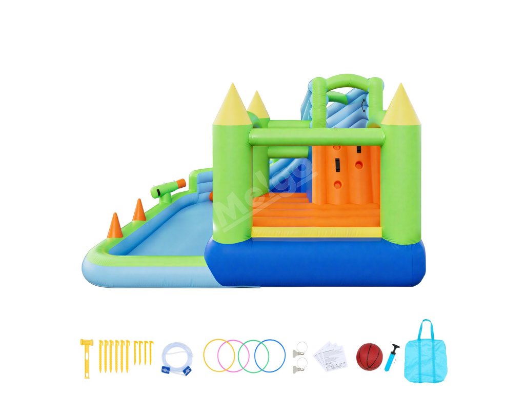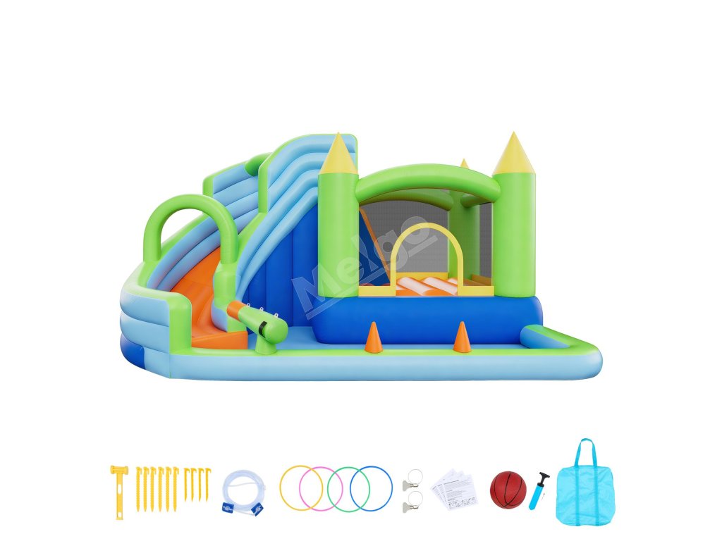 Tento nafukovací hrad s veľkou skákacou plochou a hladkou šmýkačkou ponúka deťom a rodinám viacero spôsobov, ako si užiť spoločnú zábavu. Inovatívna hra s hádzaním vodných krúžkov pridáva interaktívnu zábavu, vďaka čomu si deti môžu užiť hravé chvíle a skupinové aktivity s priateľmi počas hry vonku.