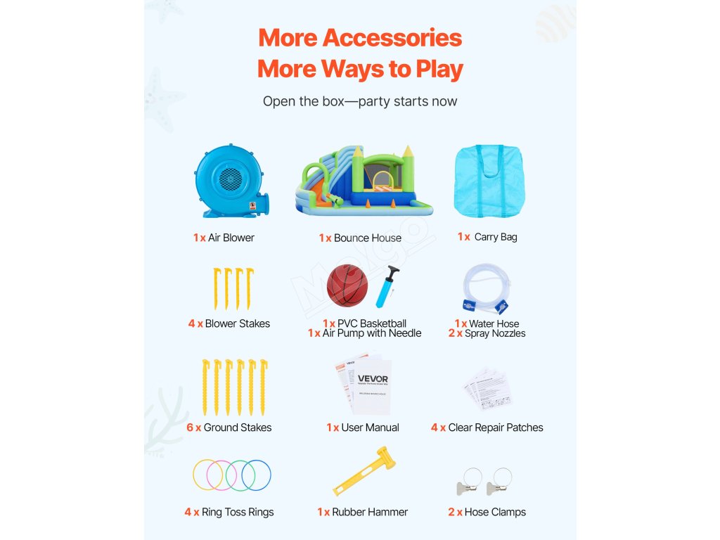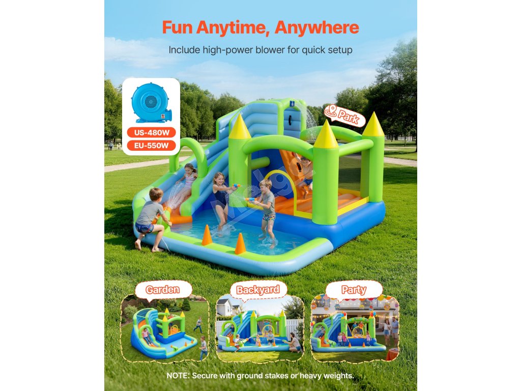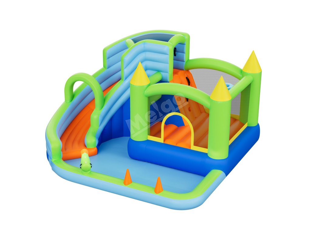 Náš nafukovací skákací hrad na suché aj mokré použitie je ideálny na narodeniny, letné posedenia a každodennú zábavu na dvore. Ponúka skákacie plochy, bazénik a mnoho ďalšieho. Je vyrobený z hrubého materiálu Oxford 840D+420D a má zosilnené dvojité švy. Je vybavený sieťkou po celom obvode, ktorá zaisťuje dobrú viditeľnosť.