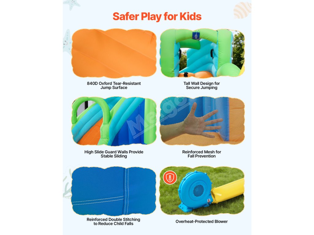 Tento detský nafukovací vodný park VEVOR kombinuje podšívku 190T s odolnou odrazovou zónou 840D, aby podporil pevný celkový tvar. Kľúčové namáhané oblasti využívajú technológiu dvojitého šitia na zlepšenie pevnosti švov, čo pomáha znížiť otvory a riziko pádu detí z bokov pri skákaní.
