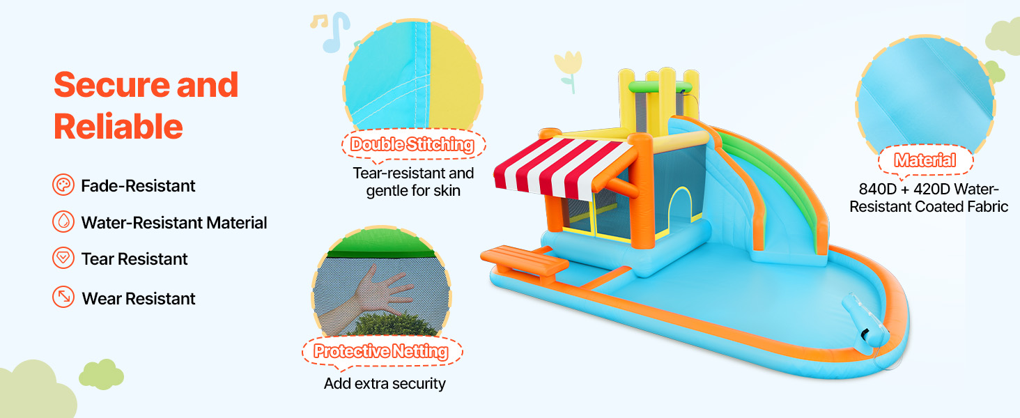 Tento detský nafukovací vodný park VEVOR kombinuje podšívku 190T s odolnou odrazovou zónou 840D, aby podporil pevný celkový tvar. Kľúčové namáhané oblasti využívajú technológiu dvojitého šitia na zlepšenie pevnosti švov, čo pomáha znížiť otvory a riziko pádu detí z bokov pri skákaní.