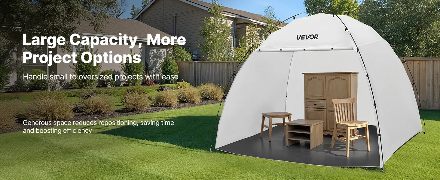 Tento prenosný stan s lakovacou kabínou má rozmery 91,7 (D) x 67,7 (Š) x 74,8 (V) palca/233 x 172 x 190 cm a zmestia sa doň stoličky, stoly a skrinky. Rýchle skladacie polyesterové nastavenie s úložnou taškou, stabilné tyče zo sklených vlákien, háky proti vetru, kolíky do zeme, okná zo sieťoviny a integrovaná podlaha zabezpečujú uprataný pracovný priestor.