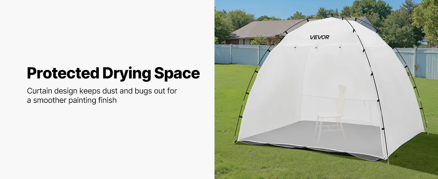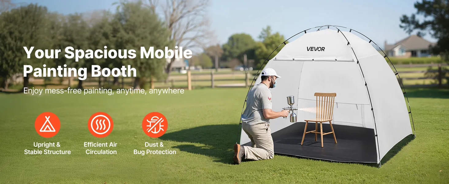 Prenosná lakovacia kabína obsahuje kolíky stabilizujúce vietor, sieťové dvere, ktoré sa rolujú a zaisťujú pomocou popruhov, a dvojvrstvové zipsy vyrobené na dlhú životnosť, ktoré zabezpečujú stabilnú a bezproblémovú prevádzku.