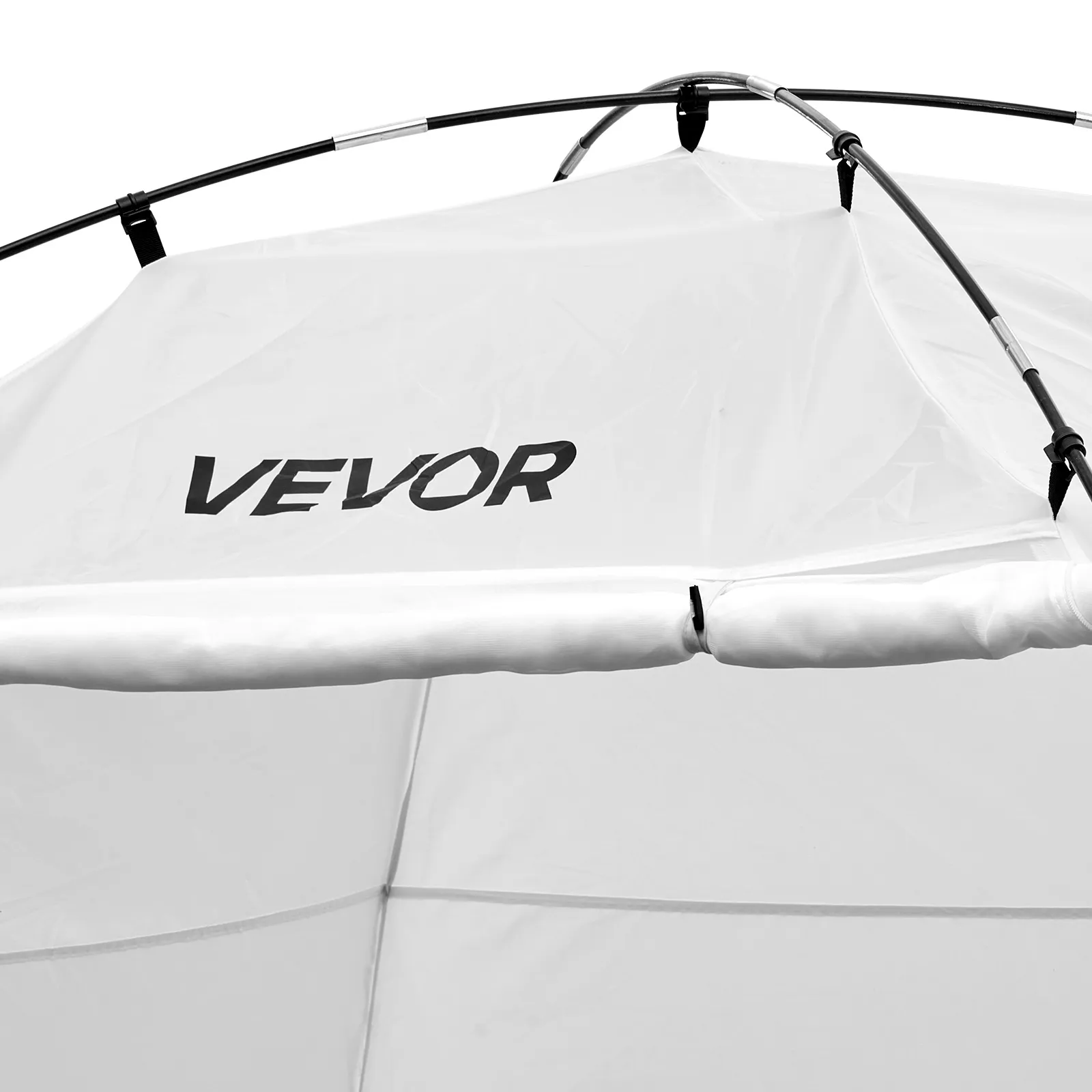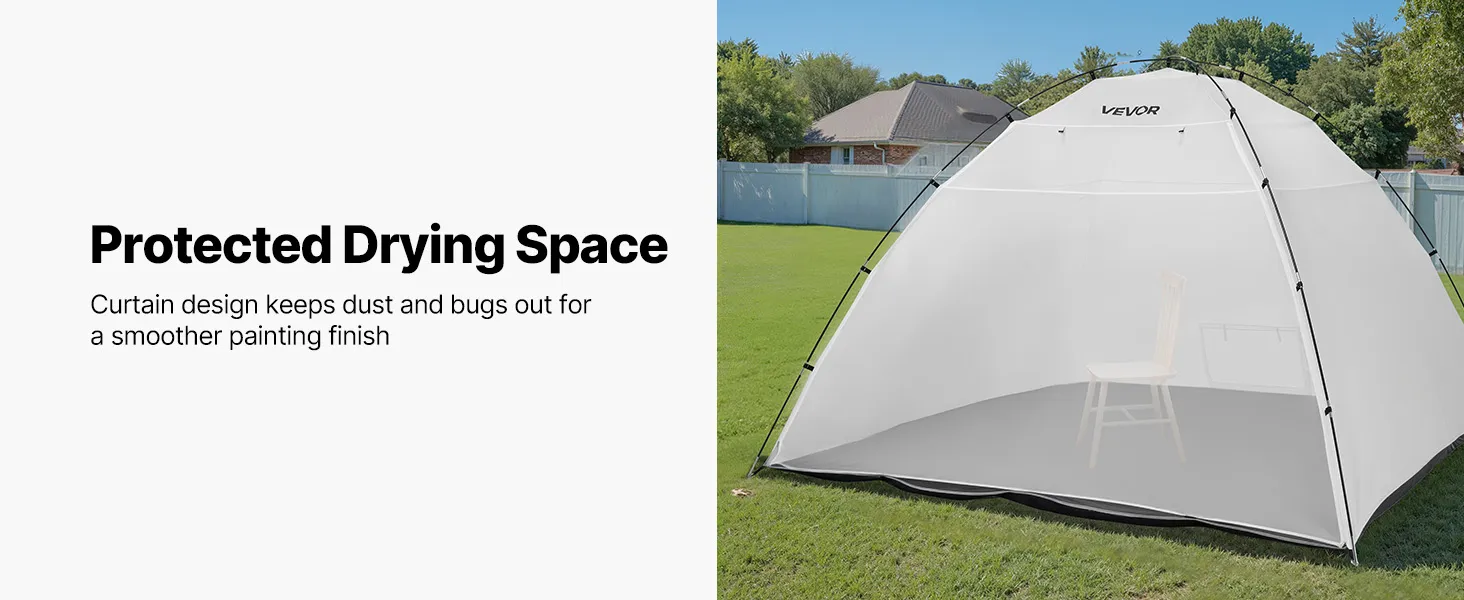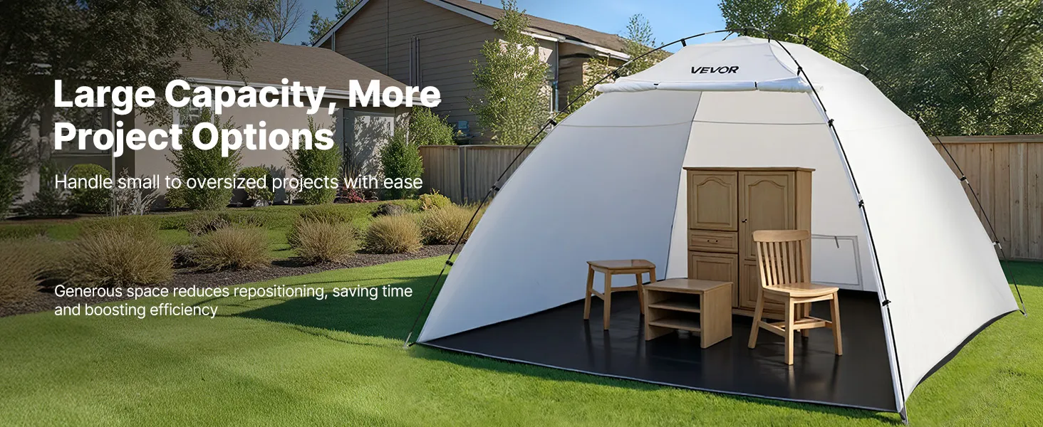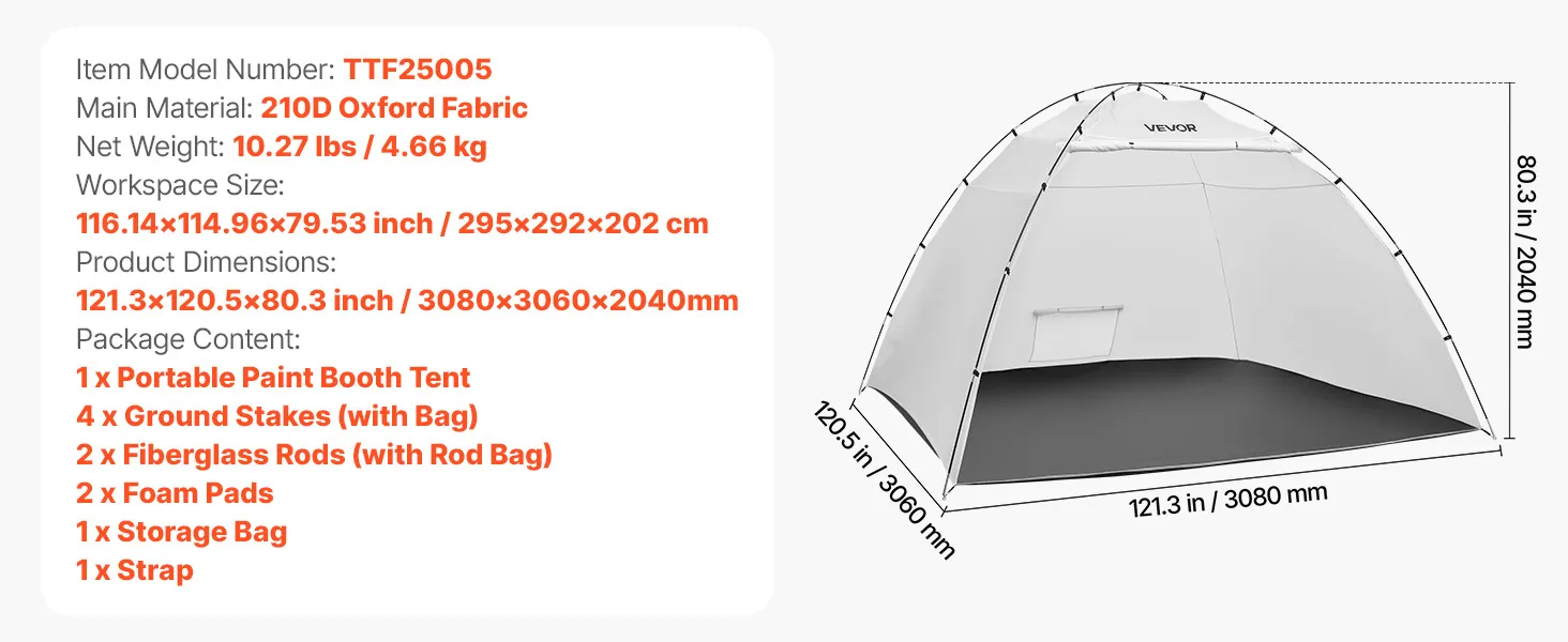 Tento prenosný stan s lakovacou kabínou má rozmery 116,14 (D) x 114,96 (Š) x 79,53 palca (V) /295 x 292 x 202 cm/ a zmestia sa do neho stoličky, stoly a skrinky. Rýchle skladacie polyesterové nastavenie s úložnou taškou, stabilné tyče zo sklených vlákien, háky proti vetru, kolíky do zeme, okná zo sieťoviny a integrovaná podlaha zabezpečujú uprataný pracovný priestor.