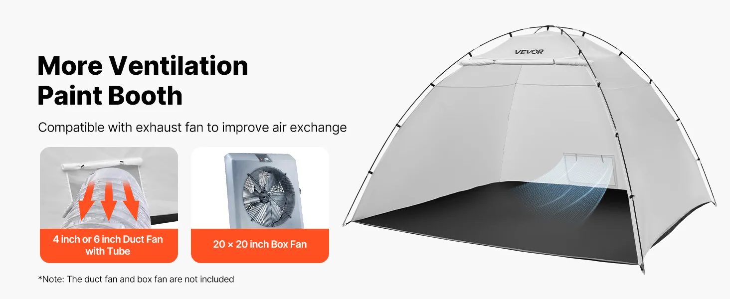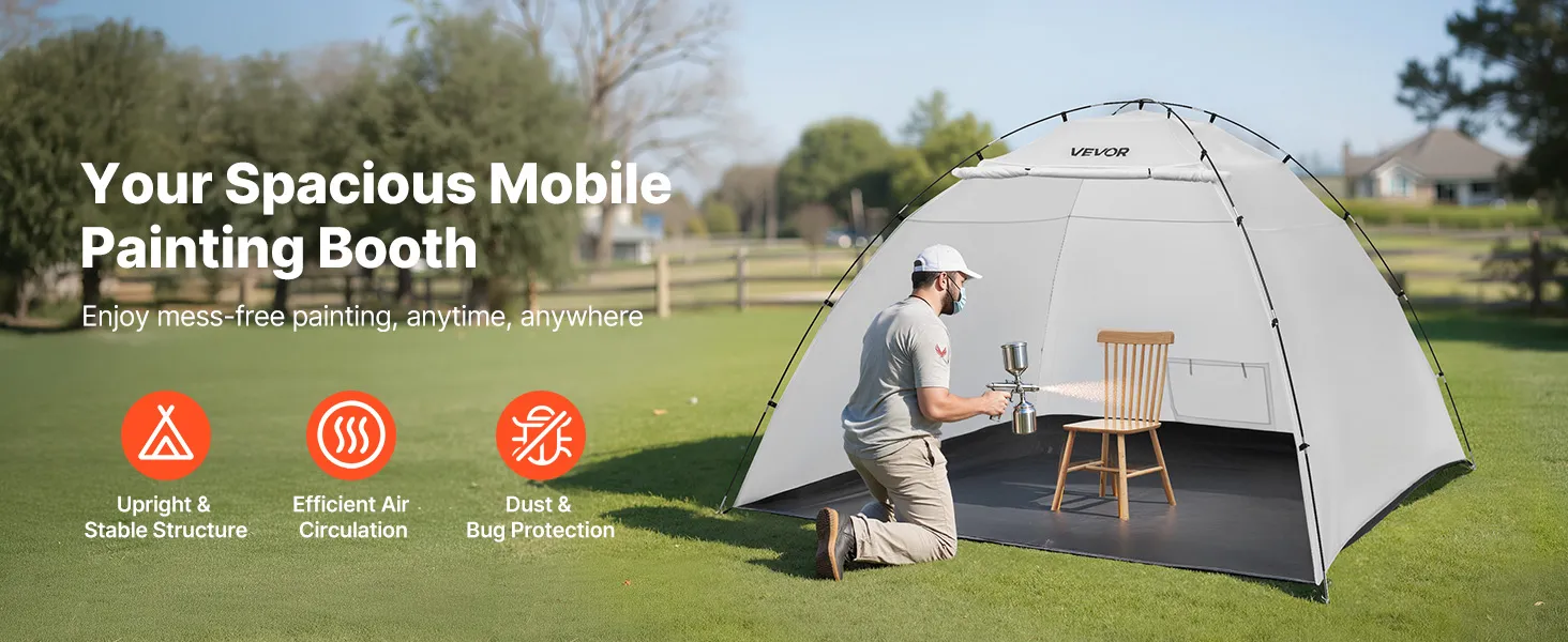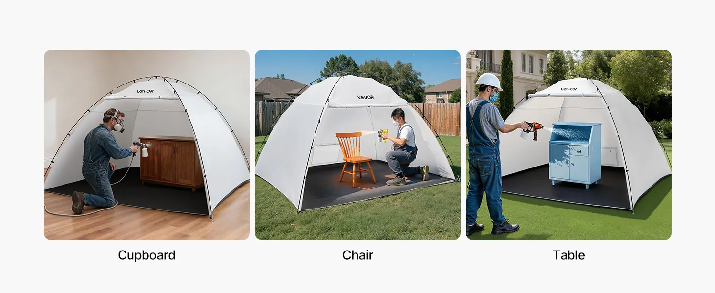 Táto prenosná lakovacia kabína je vybavená kolmi odolnými proti vetru na zvýšenie stability, rolovacími sieťovanými dverami s popruhmi na jednoduché používanie a zosilnenými dvojvrstvovými zipsami na hladký a dlhotrvajúci výkon.