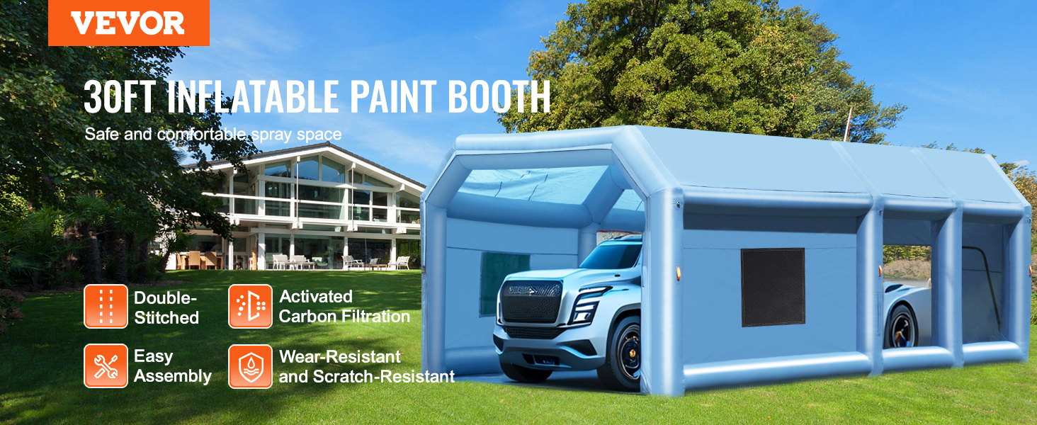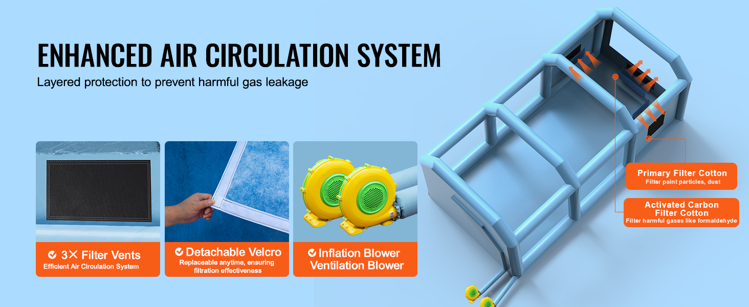 Nafukovacia striekacia kabína vybavená dvojvrstvovou filtračnou bavlnou vrátane primárneho filtra a filtra s aktívnym uhlím zabraňuje úniku škodlivých plynov a zabezpečuje neprerušované maľovanie. Filtračné okná sú navrhnuté s odnímateľnými suchými zipsami, čo umožňuje ich kedykoľvek vymeniť.