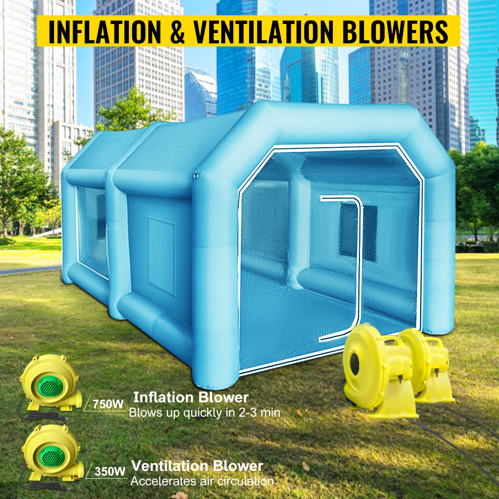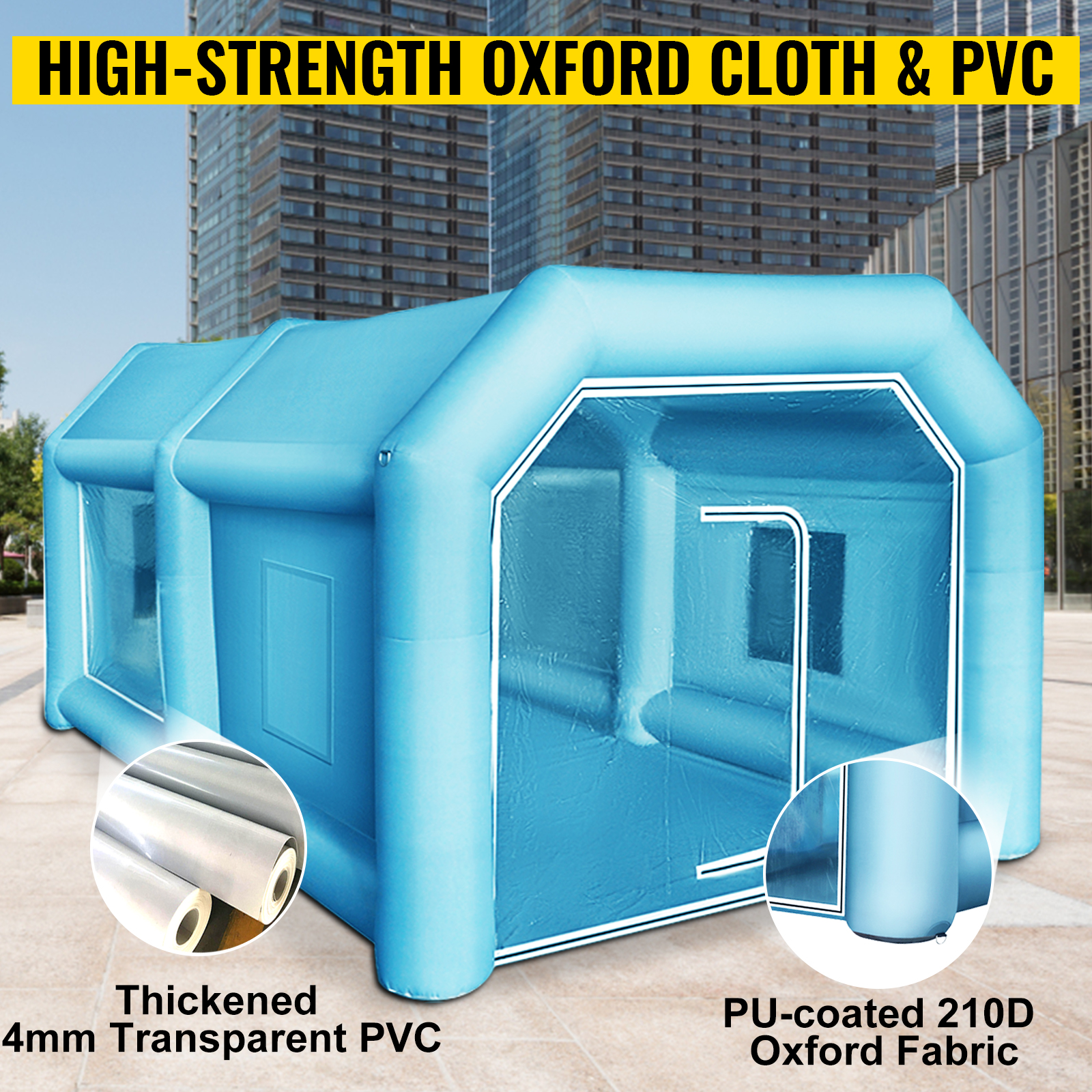 Nafukovacia lakovacia kabína využíva tkaninu Oxford 210D a materiál PVC, ktorý je odolný, odolný proti roztrhnutiu a odolný voči nečistotám. Jej vonkajšie rozmery: 13 x 8 x 7 ft. Je dostatočne priestranná na lakovanie auta alebo motocykla.