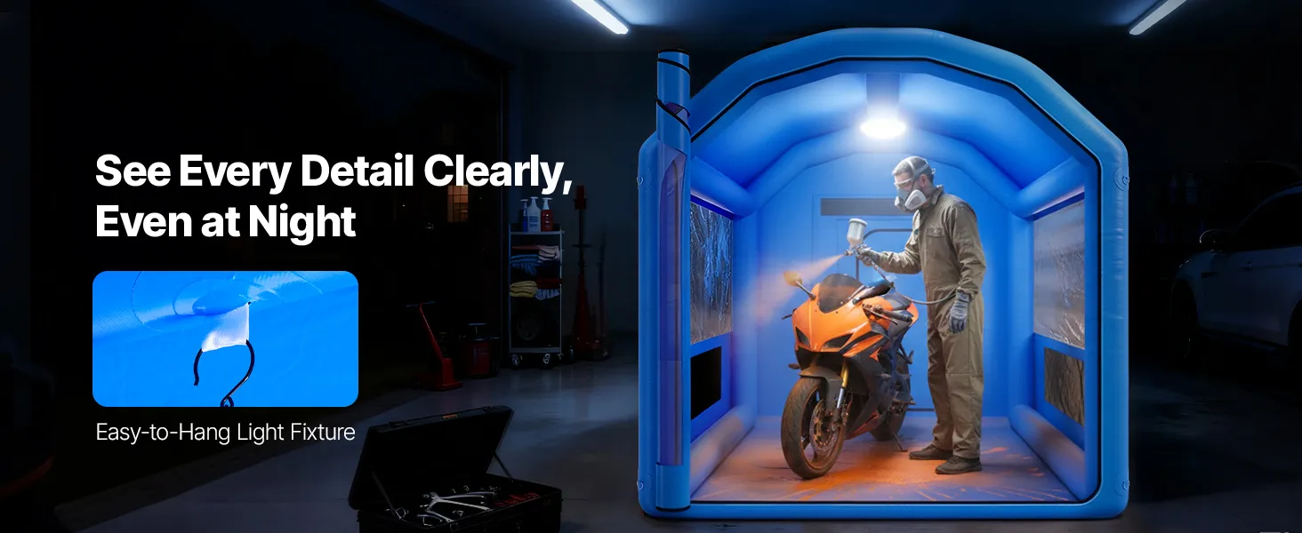 Okno je vyrobené zo zhrubnutého PVC odolného proti poškriabaniu pre krištáľovo čistú viditeľnosť. Naša nafukovacia lakovacia kabína poskytuje jasný, nerušený výhľad na váš projekt, aby ste mohli sledovať detaily a zaistiť bezchybnú, rovnomernú povrchovú úpravu.