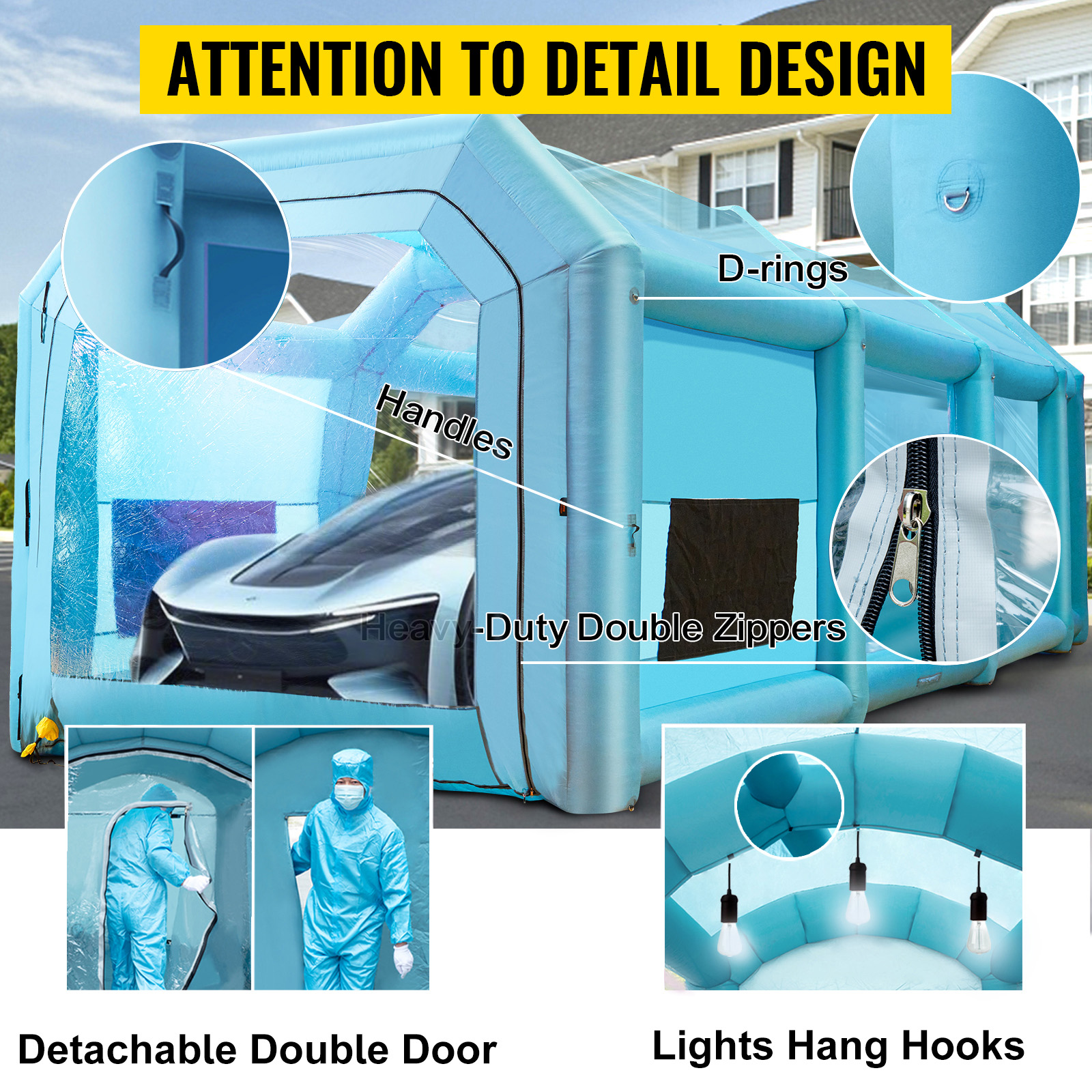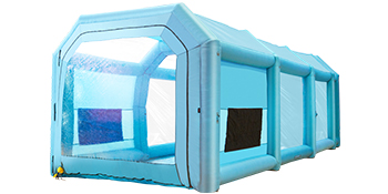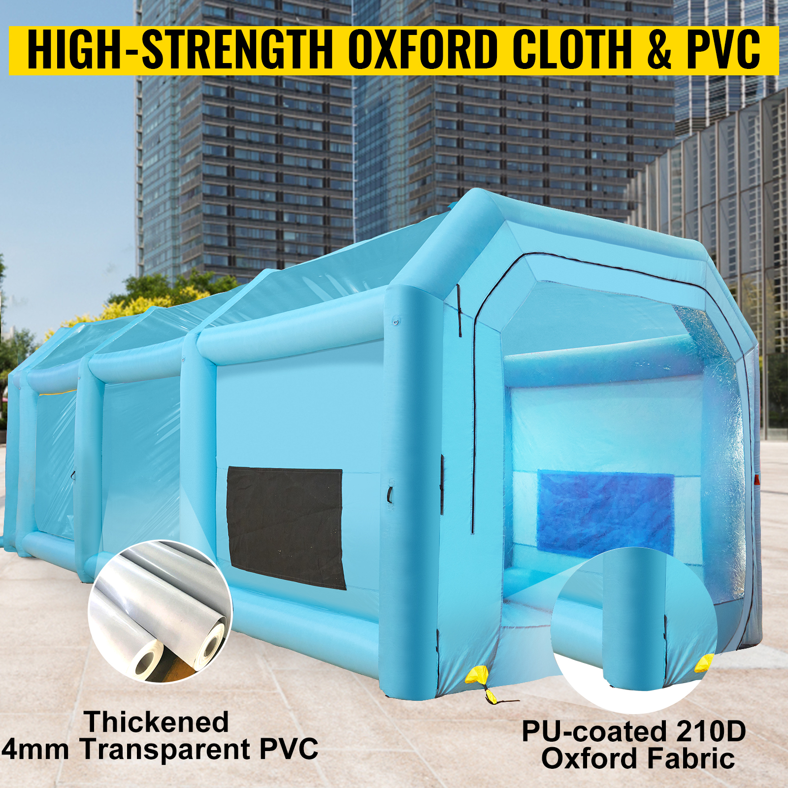 Nafukovacia lakovacia kabína využíva tkaninu Oxford 210D a materiál PVC, ktorý je odolný, odolný proti roztrhnutiu a odolný voči nečistotám. Je dostatočne priestranná na to, aby sa do nej zmestilo auto alebo motocykel, ktoré potrebujú lakovať.