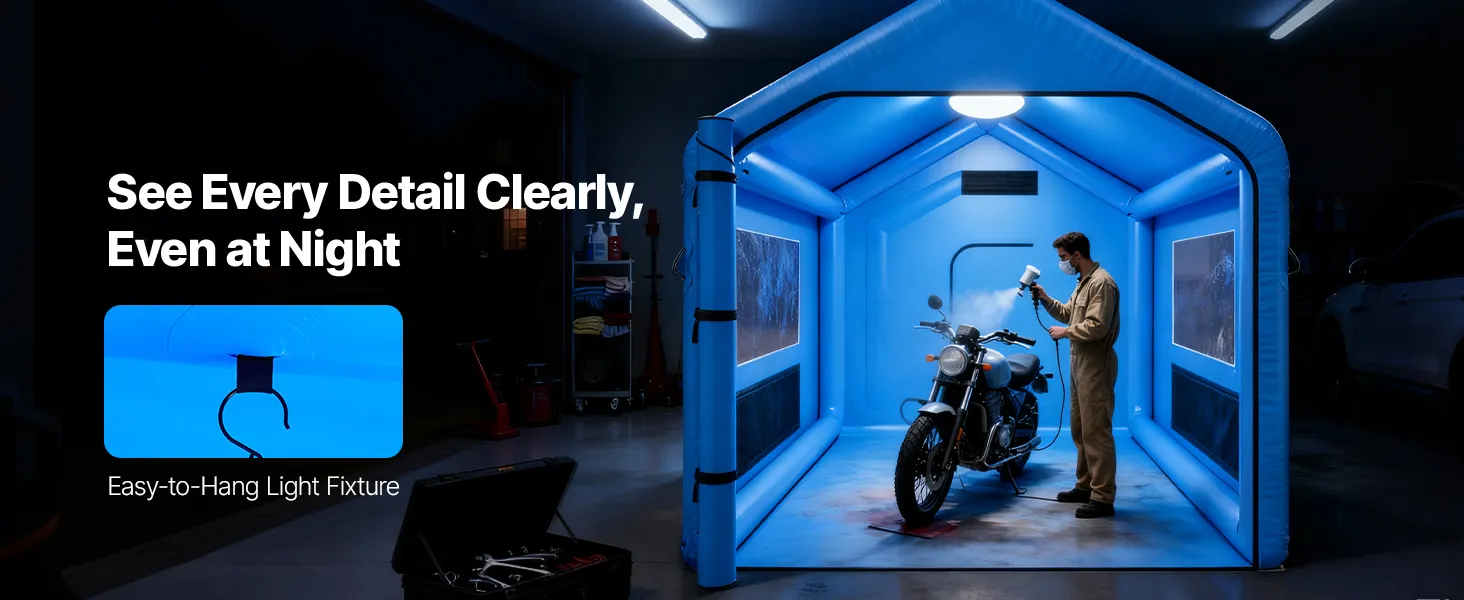 Okno je vyrobené zo zhrubnutého PVC odolného proti poškriabaniu pre krištáľovo čistú viditeľnosť. Naša nafukovacia lakovacia kabína poskytuje jasný, nerušený výhľad na váš projekt, aby ste mohli sledovať detaily a zaistiť bezchybnú, rovnomernú povrchovú úpravu.