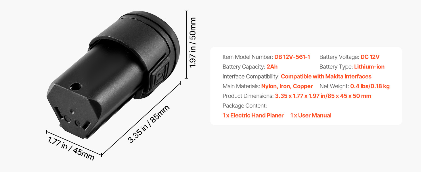 Tento lítium-iónový akumulátor s kapacitou 2,0 Ah 12V je kompatibilný s elektrickým ručným hoblíkom VEVOR 12V. Je kompaktný a prenosný, ľahko si poradí s rôznymi scenármi a jeho dlhá životnosť batérie vám umožní pracovať efektívnejšie.