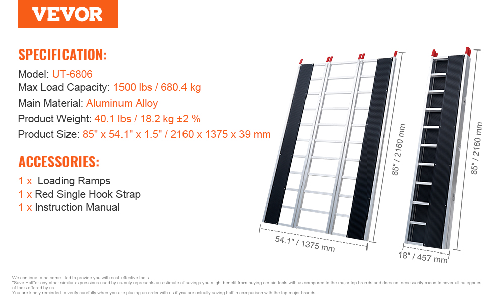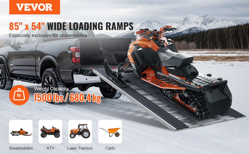Táto nakladacia rampa s rozmermi 85" x 54" je ideálna na prepravu stredných a malých vozidiel, ako sú štvorkolky a trávnaté traktory. Jej väčšia šírka umožňuje nakladať a vykladať vozidlá s bočným prídavným zariadením, ako sú snežné skútre so sánkami.