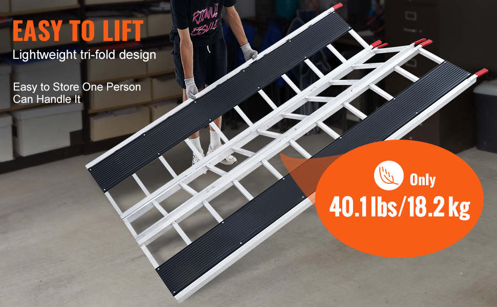 Rampa na príves sa skladá na jednoduché skladovanie a prenášanie a vďaka hliníkovej zliatine a perforovanej konštrukcii je ľahká. S rampou môže ľahko manipulovať a nastaviť ju jedna osoba.