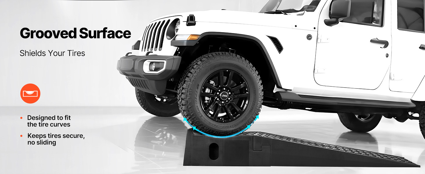 Povrch zdvíhacej rampy na autá má hlboké drážky, ktoré sa prispôsobujú krivkám pneumatík a pevne ich držia na mieste. Táto konštrukcia minimalizuje preklzávanie a zabraňuje poškodeniu pneumatík.