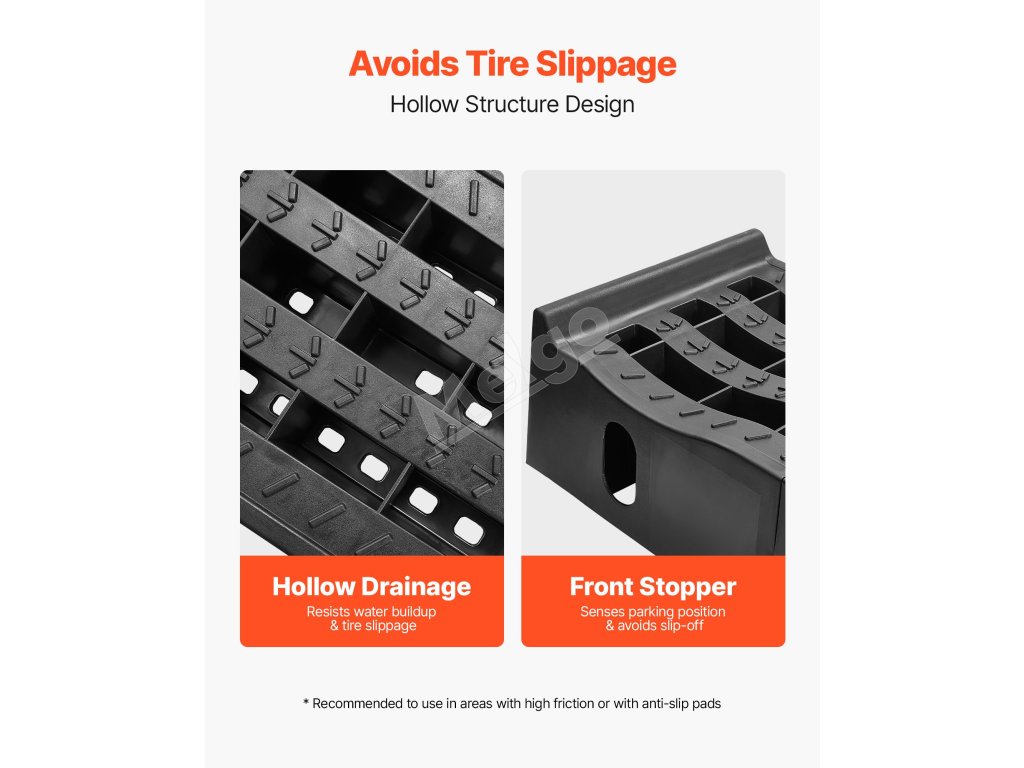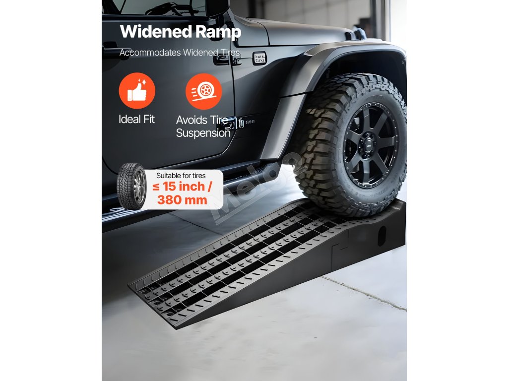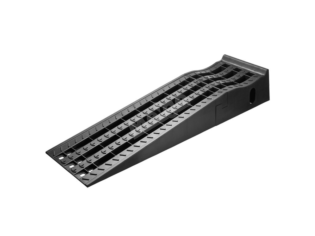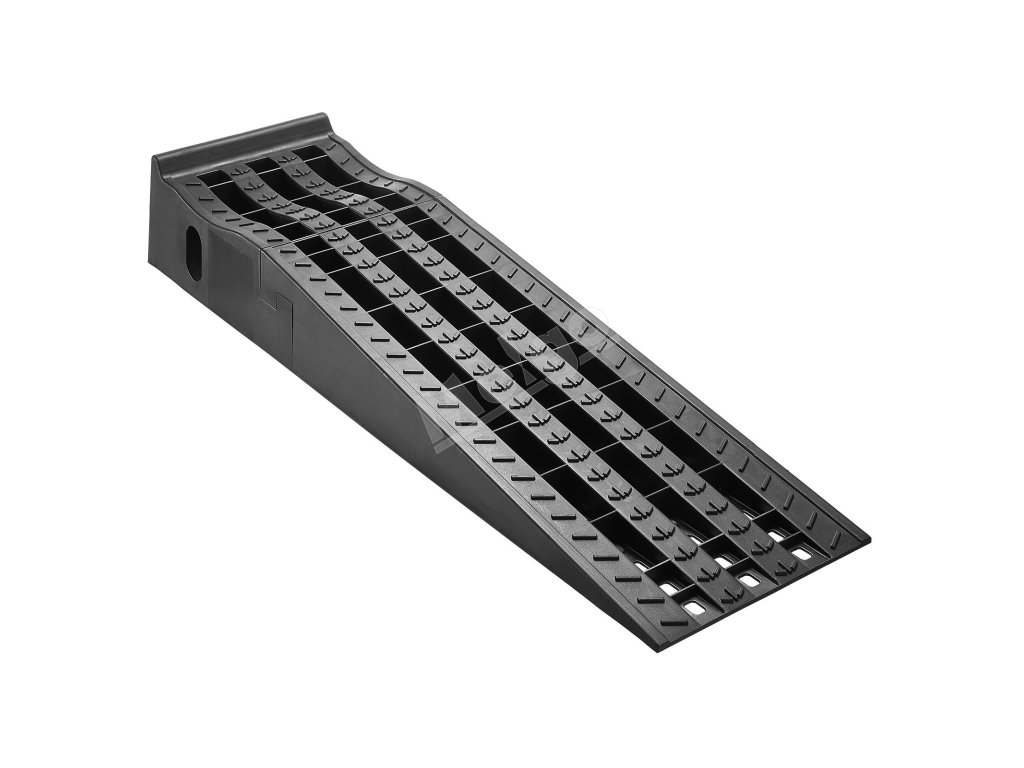 Povrch zdvíhacej rampy na autá má hlboké drážky, ktoré sa prispôsobujú krivkám pneumatík a pevne ich držia na mieste. Táto konštrukcia minimalizuje preklzávanie a zabraňuje poškodeniu pneumatík.