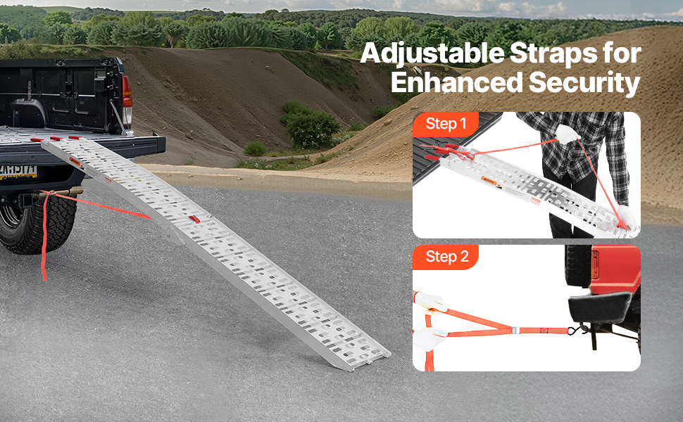 Rampa sa dodáva s nastaviteľnými bezpečnostnými popruhmi, ktoré zlepšujú stabilitu počas používania a zabraňujú skĺznutiu, čím poskytujú pokoj a väčšiu bezpečnosť počas nakladacích operácií.