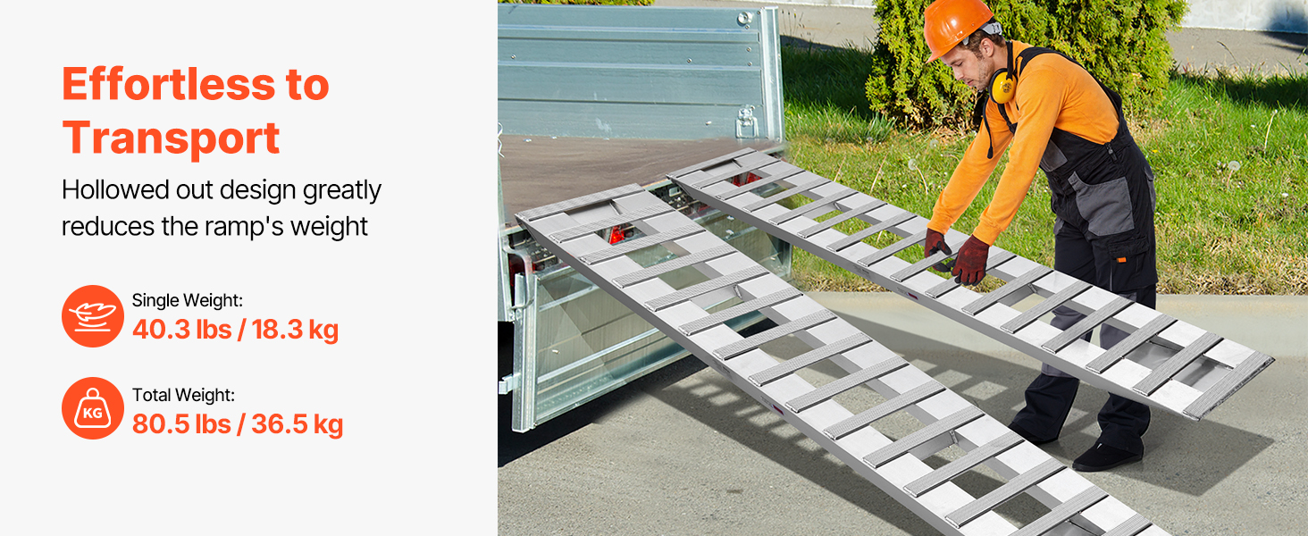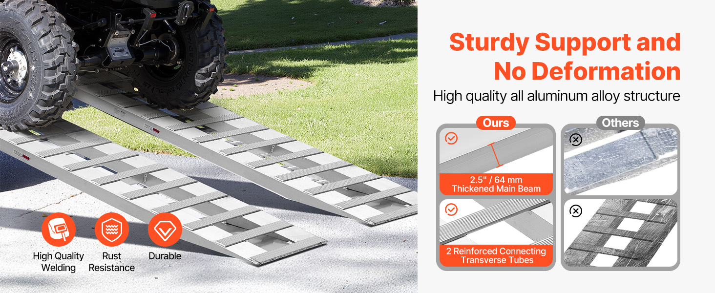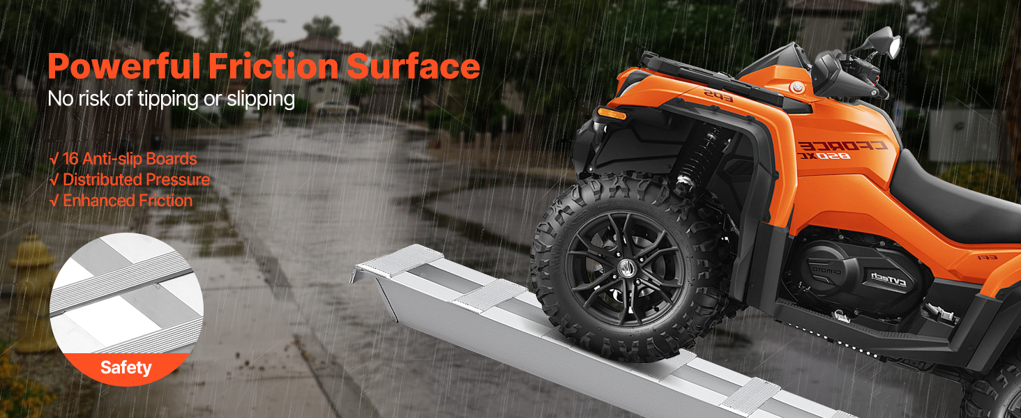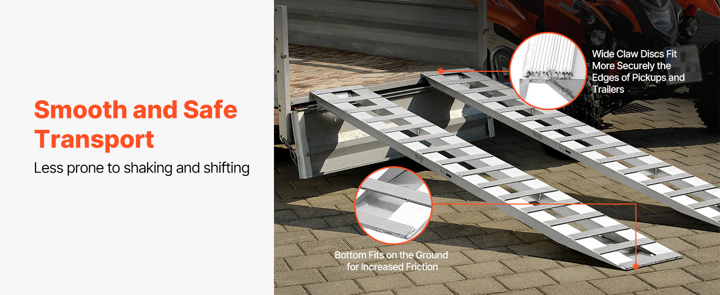 Každá priečna rúrka má husté drážkované vzory, ktoré zvyšujú priľnavosť pneumatík a znižujú kĺzanie. Táto hliníková nakladacia rampa poskytuje stabilnú trakciu v suchých aj mokrých podmienkach.