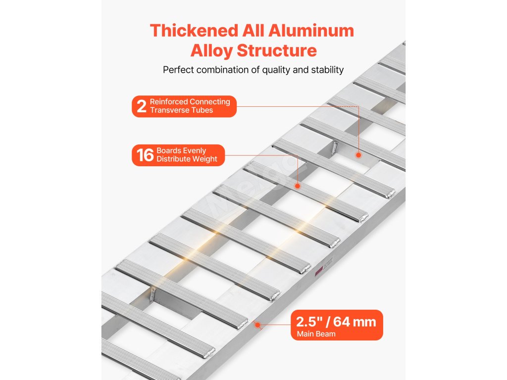 Každá priečna rúrka má husté drážkované vzory, ktoré zvyšujú priľnavosť pneumatík a znižujú kĺzanie. Táto hliníková nakladacia rampa poskytuje stabilnú trakciu v suchých aj mokrých podmienkach.