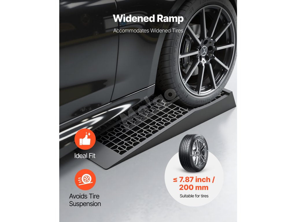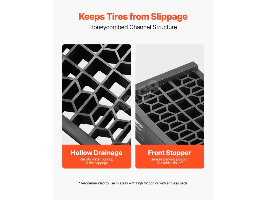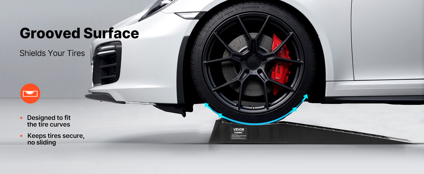 Povrch zdvíhacej rampy na autá má hlboké drážky, ktoré sa prispôsobujú krivkám pneumatík a pevne ich držia na mieste. Táto konštrukcia minimalizuje preklzávanie a zabraňuje poškodeniu pneumatík.