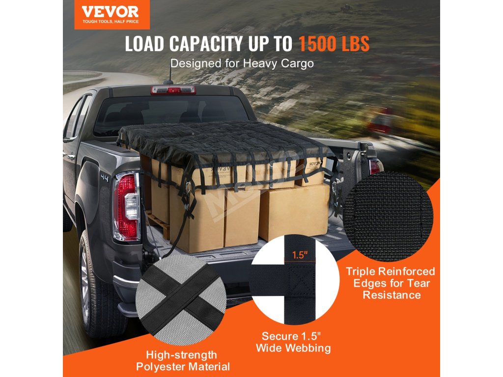 Sieť na náklad VEVOR má nosnosť až 1500 lbs, ktorá je určená na nakladanie ťažkých nákladov, takže sa nemusíte obávať, či už sa sťahujete alebo prepravujete.