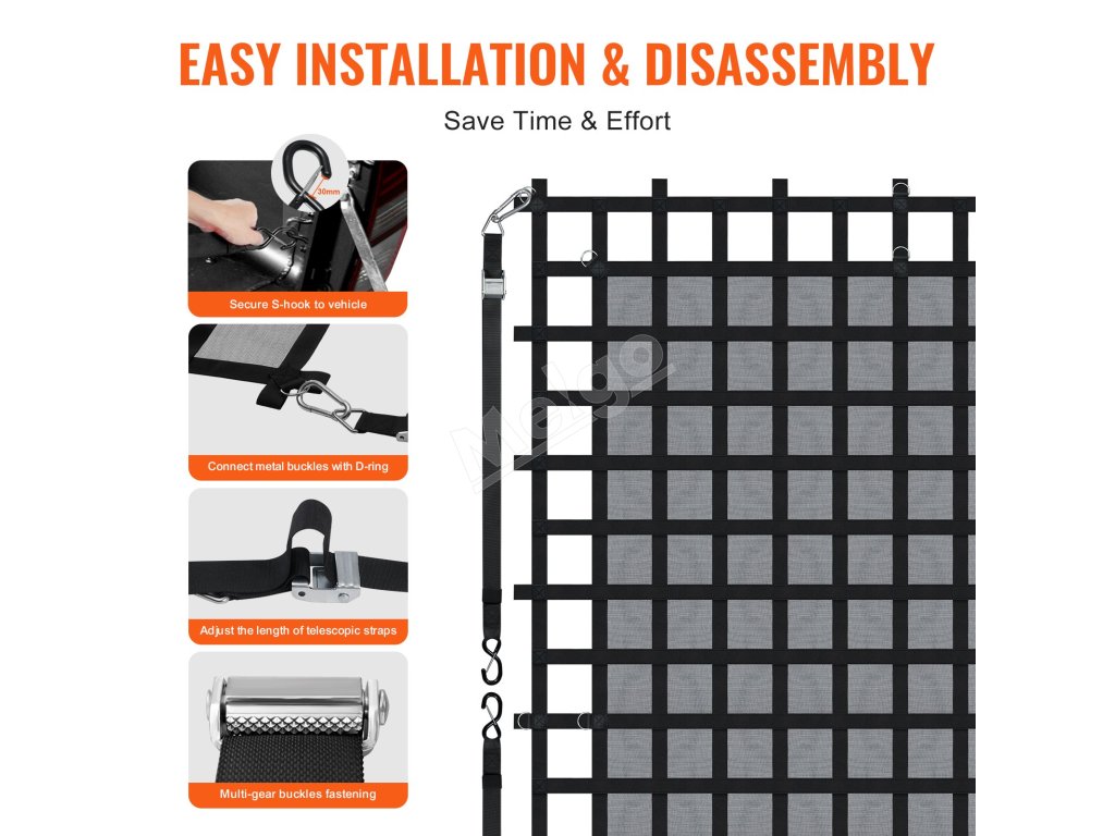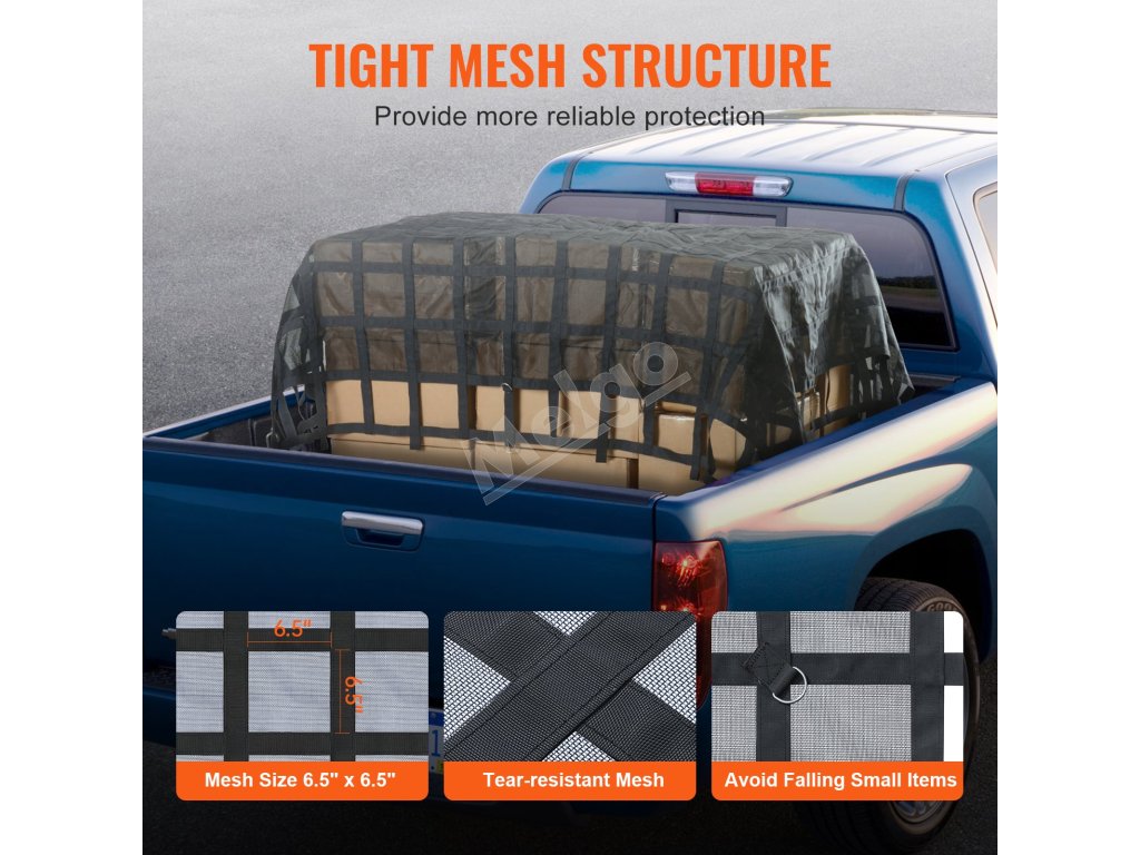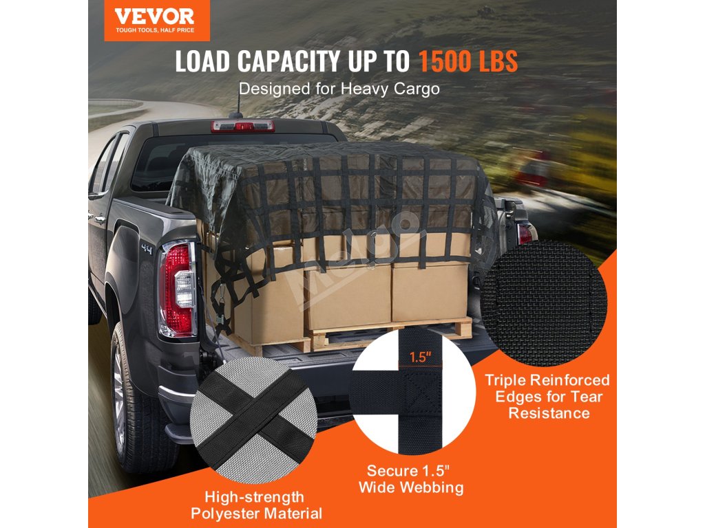 Sieť na náklad VEVOR má nosnosť až 1500 lbs, ktorá je určená na nakladanie ťažkých nákladov, takže sa nemusíte obávať, či už sa sťahujete alebo prepravujete.