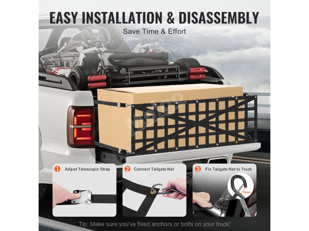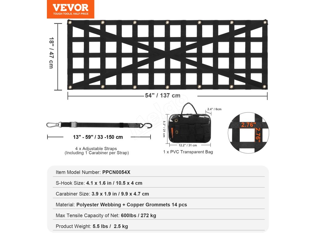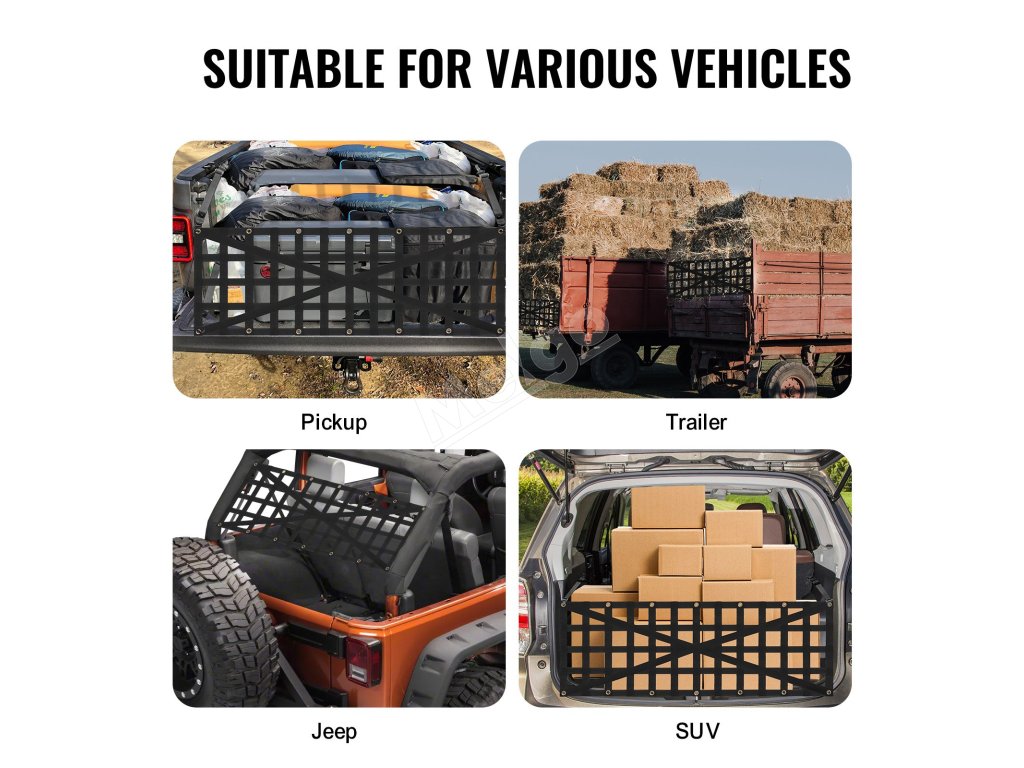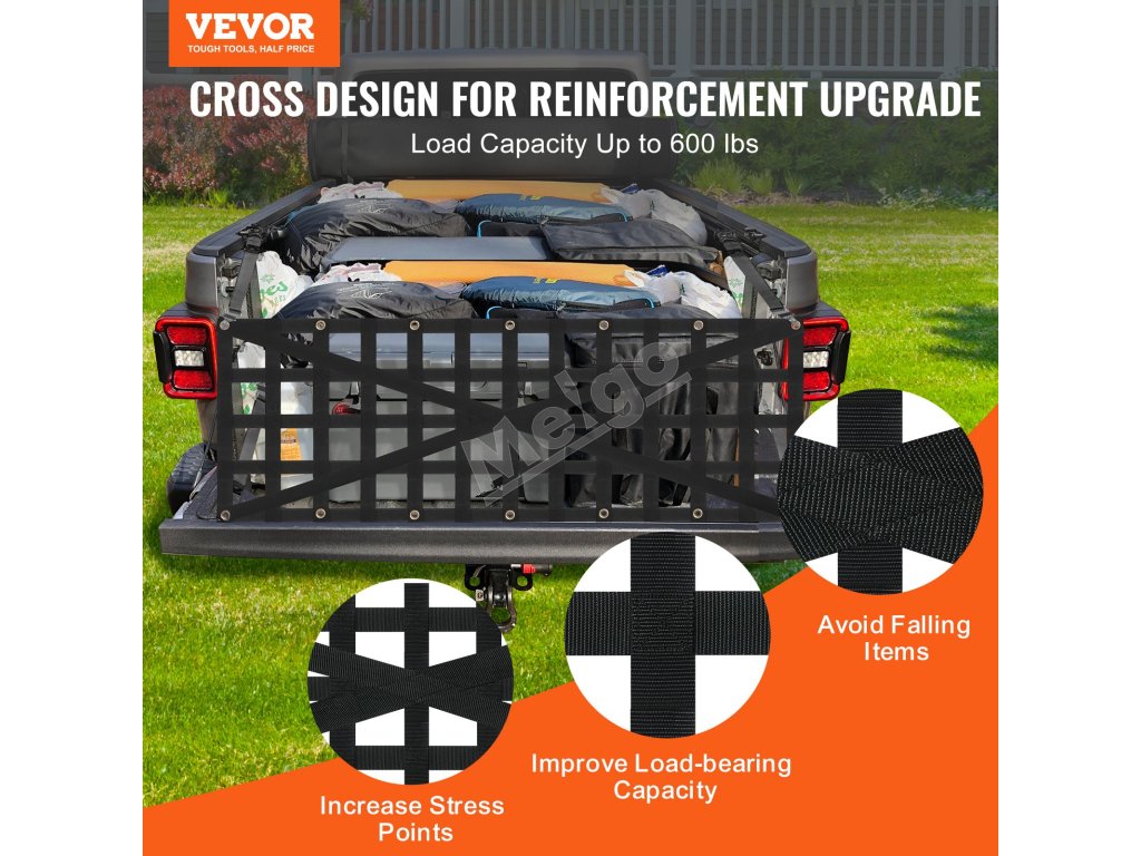 Sieť na zadné dvere VEVOR využíva vylepšenú konštrukciu krížových popruhov na rozloženie zaťaženia. Nosnosť našej siete na zadné dvere je až 600 kg, čo je vhodné na upevnenie všetkých druhov mimoriadne dlhých a ťažkých nákladov a zvyšuje bezpečnosť prepravy nákladu.