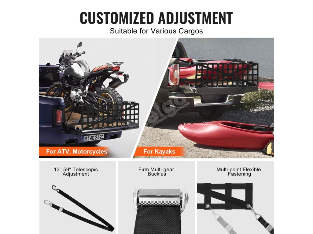 Naša sieť na zadné dvere je vybavená 4 nastaviteľnými teleskopickými popruhmi s dĺžkou až 59" a 14 kovovými upevňovacími okami. Môžete upevniť rôzne veľkosti a tvary predmetov podľa svojich potrieb a rozšíriť tak kapacitu batožinového priestoru vášho vozidla.