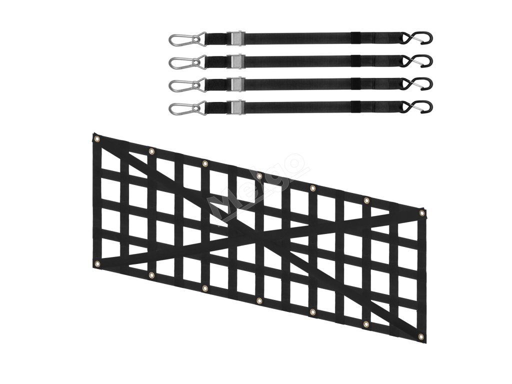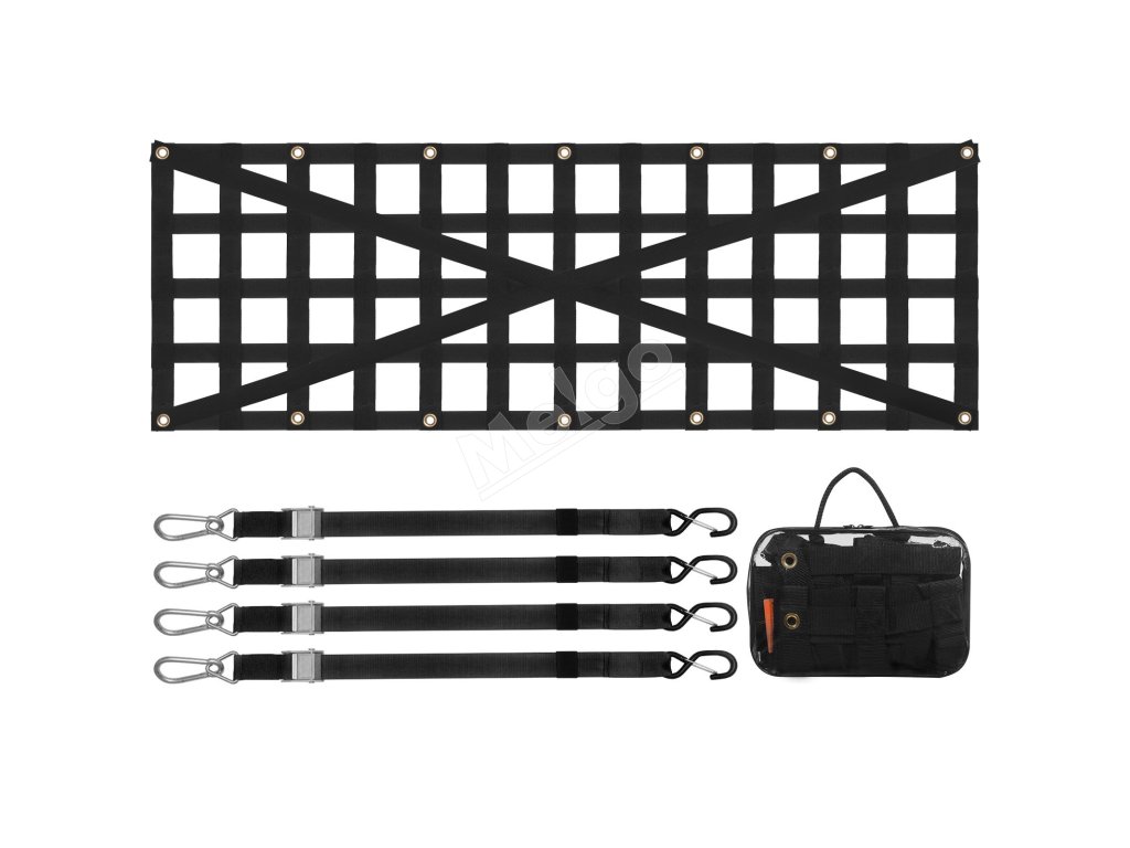 Každý teleskopický popruh sa dodáva s karabínou a S-háčikom, ľahko sa inštaluje a demontuje bez použitia náradia. Poznámka: Sieť na zadné dvere si vyžaduje použitie pevných kotiev alebo skrutiek.