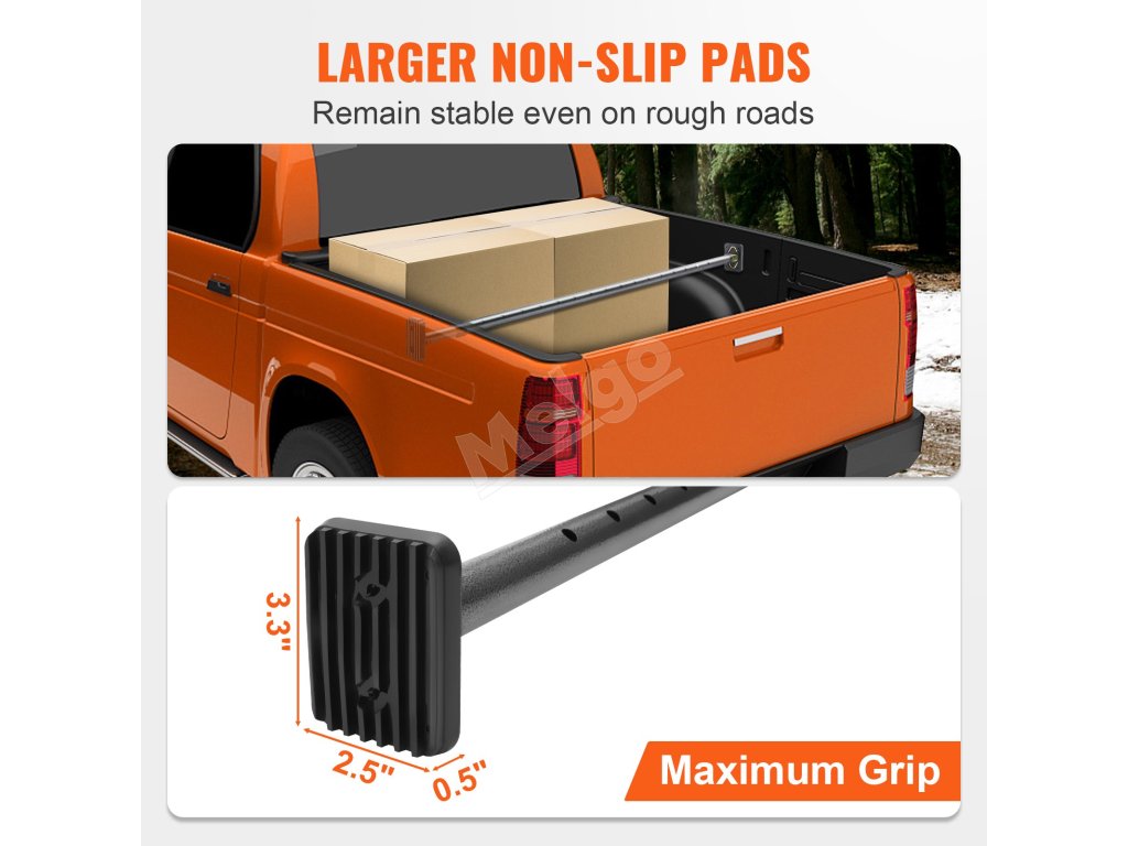 Naša nákladná tyč je na oboch koncoch vybavená gumovými podložkami s rozmermi 2,5 × 3,3 palca a poskytuje výnimočný protišmykový výkon. Zostane na svojom mieste, aj keď čelí vode alebo otrasom a vibráciám na hrboľatej ceste.