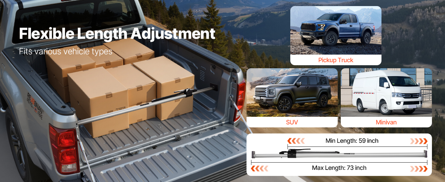 Voľne nastaviteľnú tyč stabilizátora nákladu môžete podľa potreby predĺžiť alebo zasunúť v rozsahu od 59 do 73 palcov, čím zabezpečíte optimálne upevnenie nákladu.