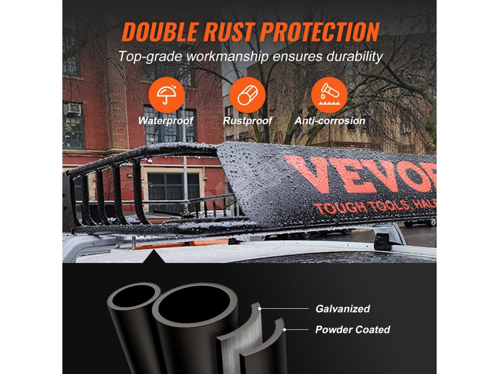 Košík na náklad na strešný nosič VEVOR je odolný voči poveternostným vplyvom, dokáže odolať dažďu, slnku a iným nepriaznivým podmienkam. Táto kombinácia nástreku a pozinkovania poskytuje vynikajúcu ochranu, takže kôš zostane v dobrej kondícii po dlhú dobu. Či už jazdíte v silnom daždi alebo pod páliacim slnkom, váš náklad bude v bezpečí vďaka spoľahlivosti koša v rôznych podmienkach, čo z neho robí spoľahlivú voľbu pre všetky vaše cestovné potreby.