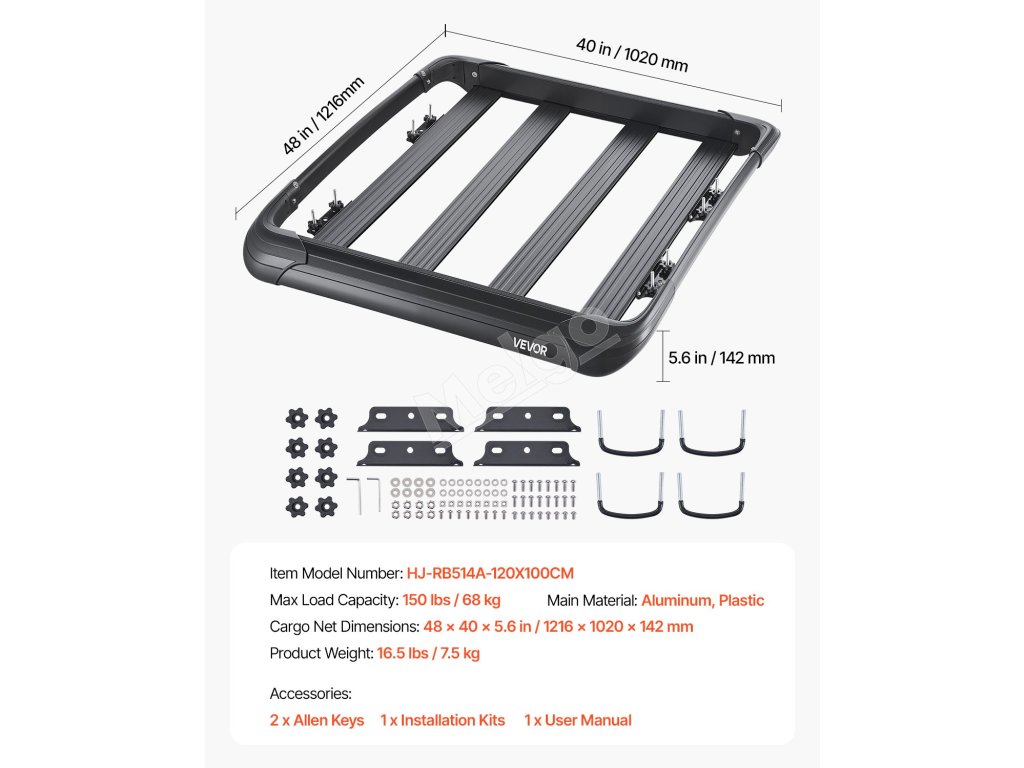 Strešný kôš na batožinu 48×40×5.6 in, nosnosť 150 lbs, 4.1 in plot