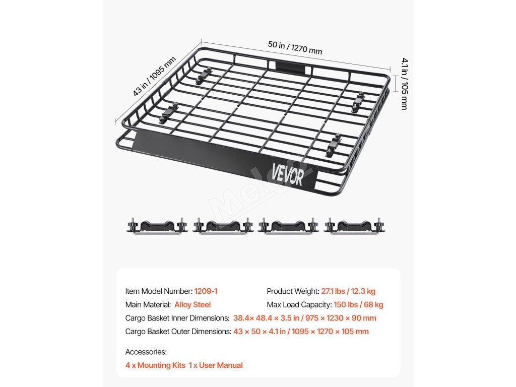 Strešný košík na batožinu 43×50×4.1 in, nosnosť 150 lbs, oceľ