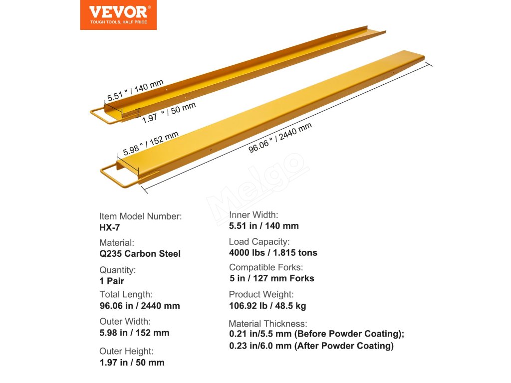Tieto predĺženia vidlíc vysokozdvižných vozíkov sú vyrobené z priemyselne odolnej uhlíkovej ocele. Sú skonštruované ako tank a pripravené zvládnuť ťažkú prácu bez toho, aby sa zapotili. Jednodielna konštrukcia zaručuje, že zostanú pevné a stabilné, nedochádza tu k žiadnemu ohýbaniu ani deformácii!