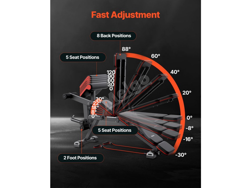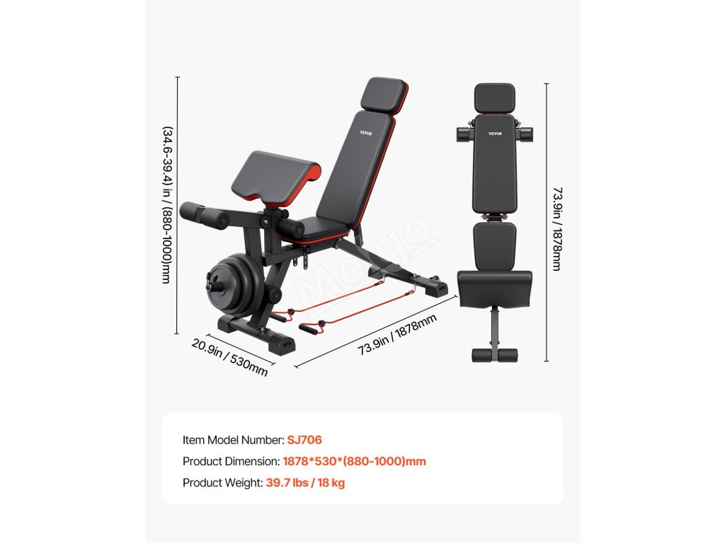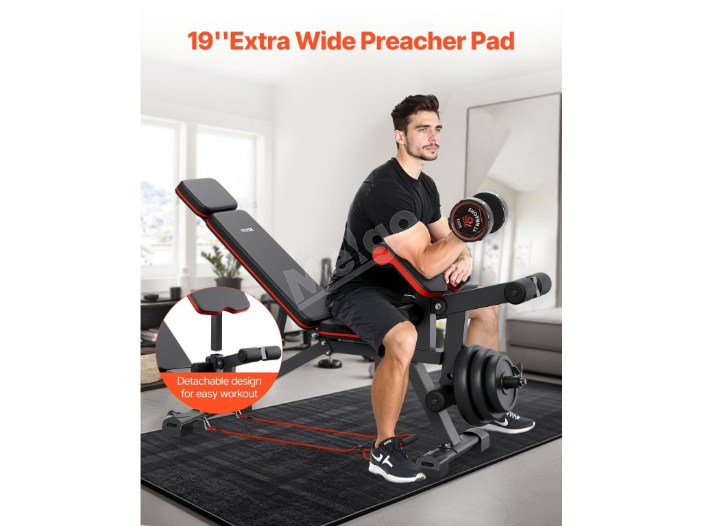Táto posilňovacia lavička obsahuje odnímateľný nadstavec na nohy a 19-palcovú extra širokú podložku na preacher. Preacherova podložka je nastaviteľná do 5 polôh a konštrukcia na opretie dvojitých nôh je kompatibilná so 3-4 záťažovými doskami (1/2-palcová tyč na činky).