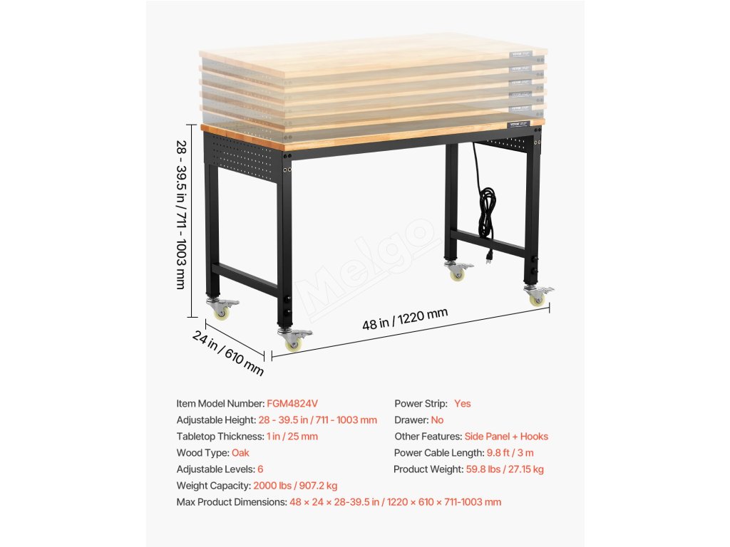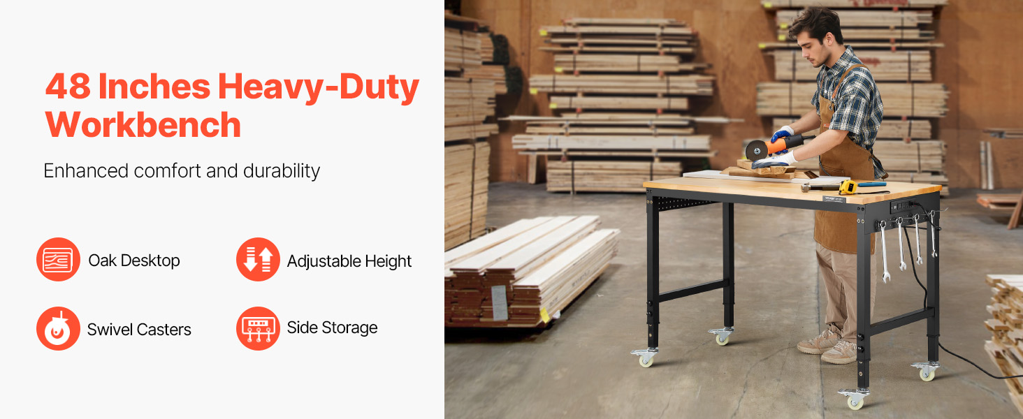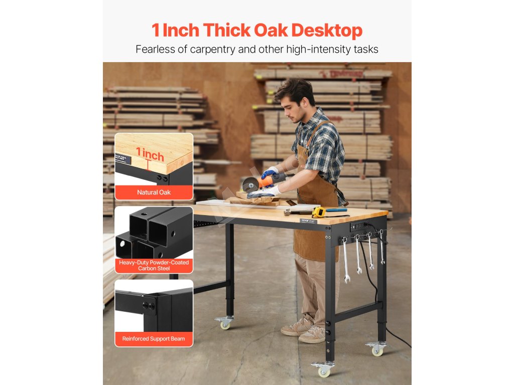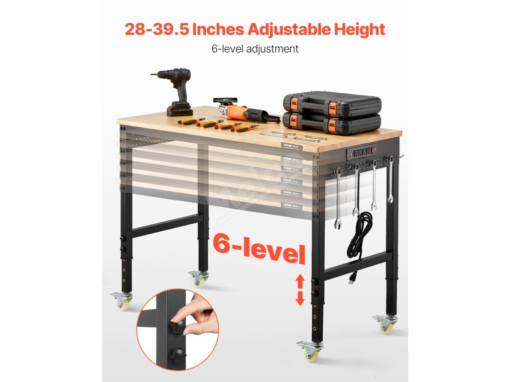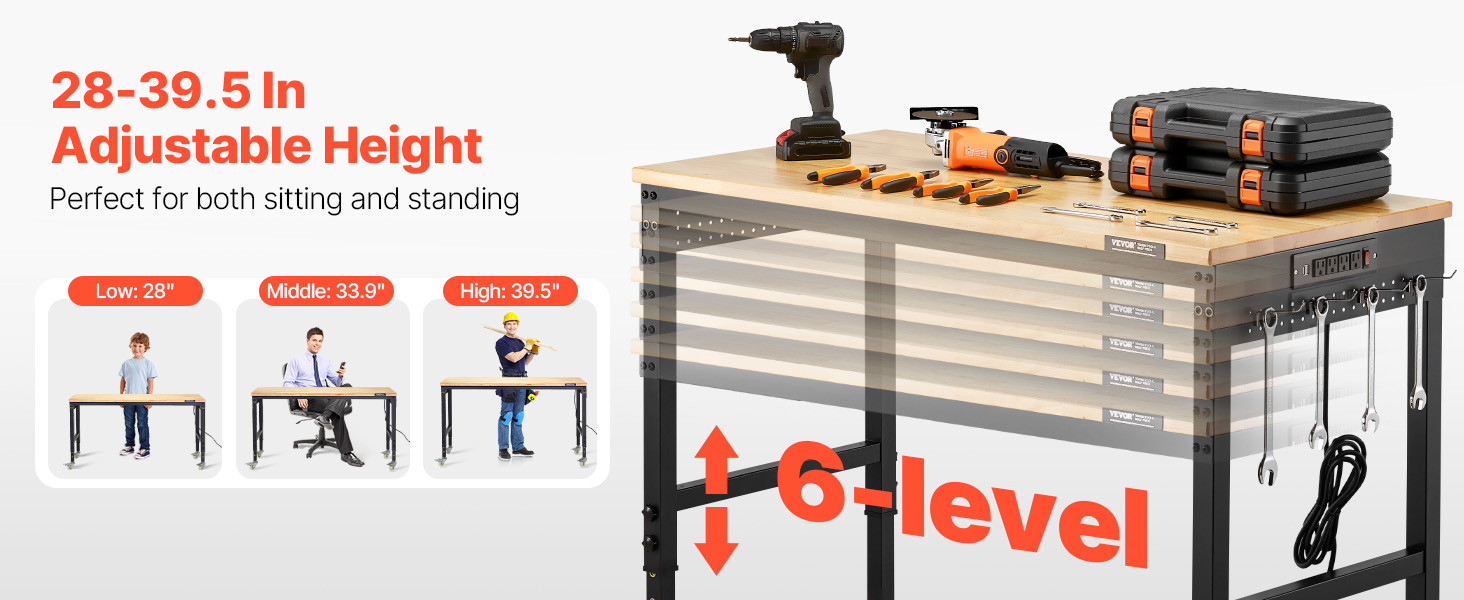 Nájdite si ideálnu výšku vďaka 6 nastaveniam od 28 do 39,5 palca! Dubová doska našej dielenskej lavice s hrúbkou 1 palec je trvanlivá a odolná voči vlhkosti, v kombinácii so silnou uhlíkovou oceľou poskytuje pevnú a spoľahlivú pracovnú plochu.