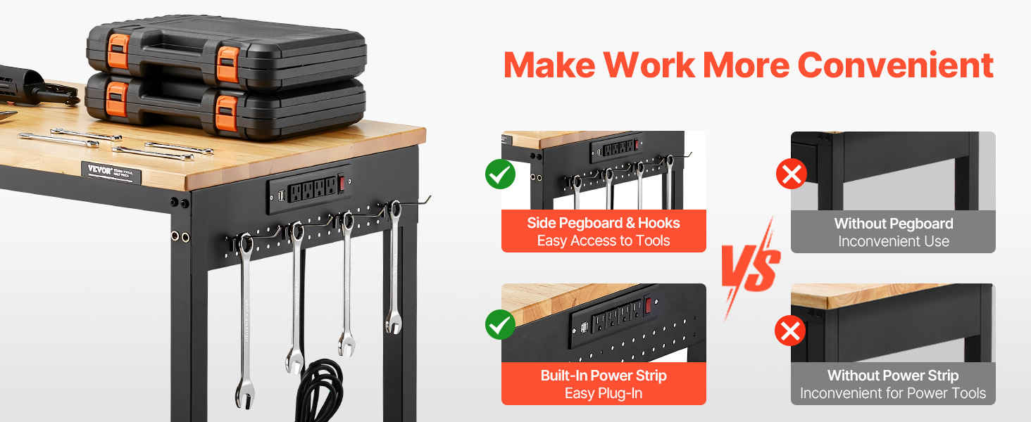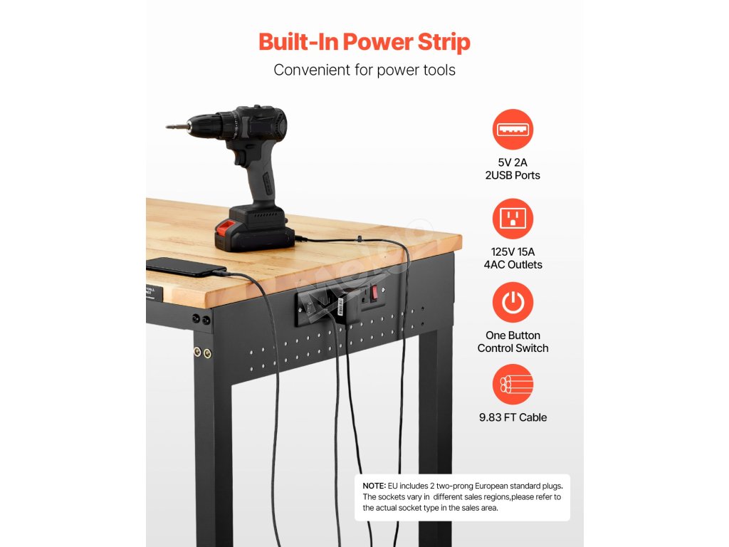 Bočné panely a háčiky nášho pracovného stola udržia vaše náradie usporiadané, zatiaľ čo zabudovaná elektrická zásuvka (certifikát ETL) umožňuje mimoriadne pohodlné napájanie všetkého, čo potrebujete!