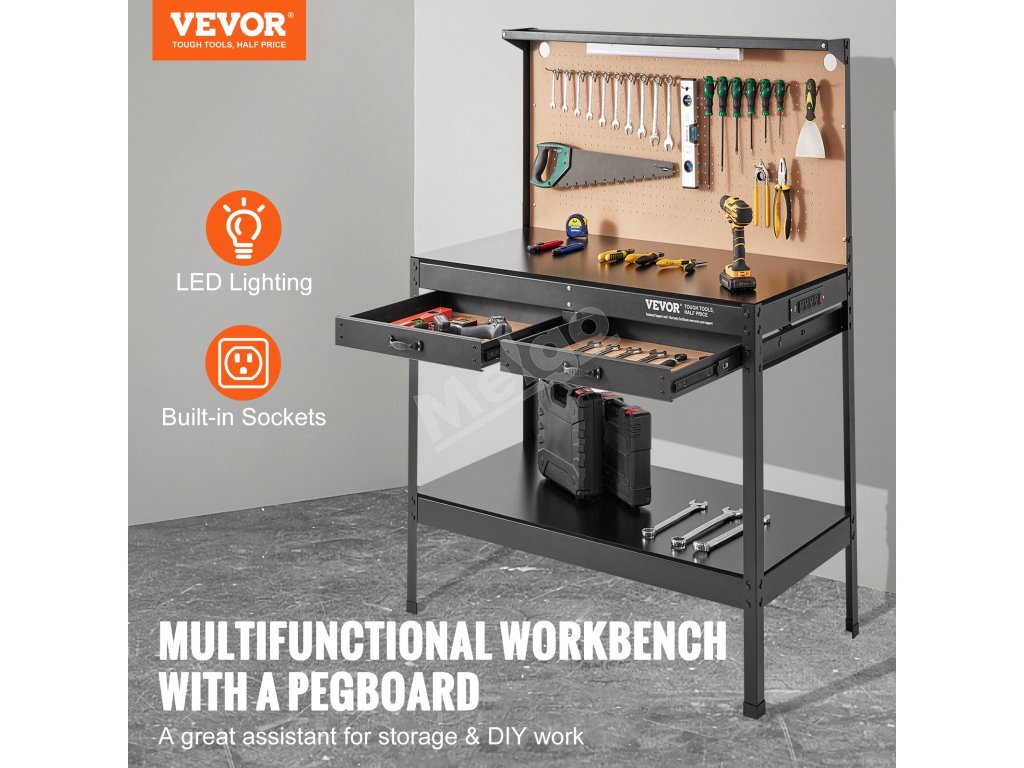 Pracovný stôl z kolíkovej dosky má zabudované elektrické zásuvky so 4 zásuvkami na striedavý prúd a 2 porty USB, čo vám umožní používať viacero nástrojov naraz.