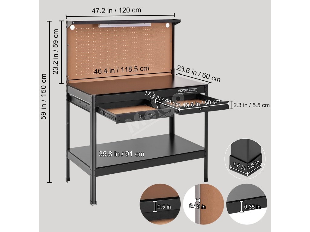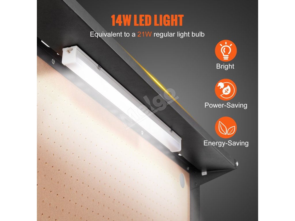 Vďaka maximálnej nosnosti 220 libier náš multifunkčný pracovný stôl ľahko zvládne aj náročné projekty. Vďaka 14W systému LED osvetlenia, zabudovanému napájaciemu panelu a praktickým úložným zásuvkám je tento pracovný stôl s kolíkovou doskou dokonalým spoločníkom pre váš pracovný priestor.
