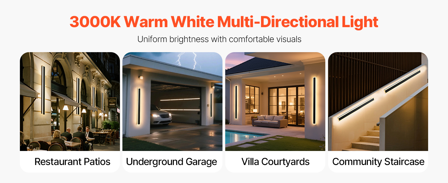 Toto exteriérové nástenné svietidlo, ktoré dodáva teplé biele svetlo s teplotou 3000 K smerom nahor, nadol a do strán, ľahko vytvára jemnú atmosféru vo vonkajších jedálenských priestoroch a vilových dvoroch. Poskytuje neoslňujúce osvetlenie, zvýrazňuje orientačné body alebo navádzacie cesty a zároveň zabezpečuje praktickú viditeľnosť.
