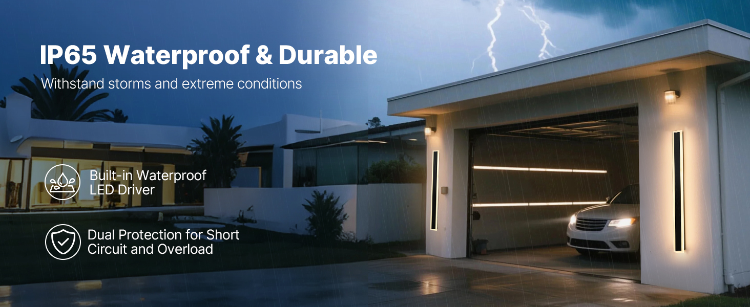 Vďaka vodotesnosti IP65 má naše vonkajšie nástenné svietidlo vynikajúce vodotesné a vzduchotesné vlastnosti, ktoré odolávajú extrémnym poveternostným podmienkam, ako sú búrky a silný vietor. Zabudovaný vodotesný LED ovládač je vybavený ochranou proti skratu a preťaženiu, čím zabezpečuje spoľahlivú prevádzku.