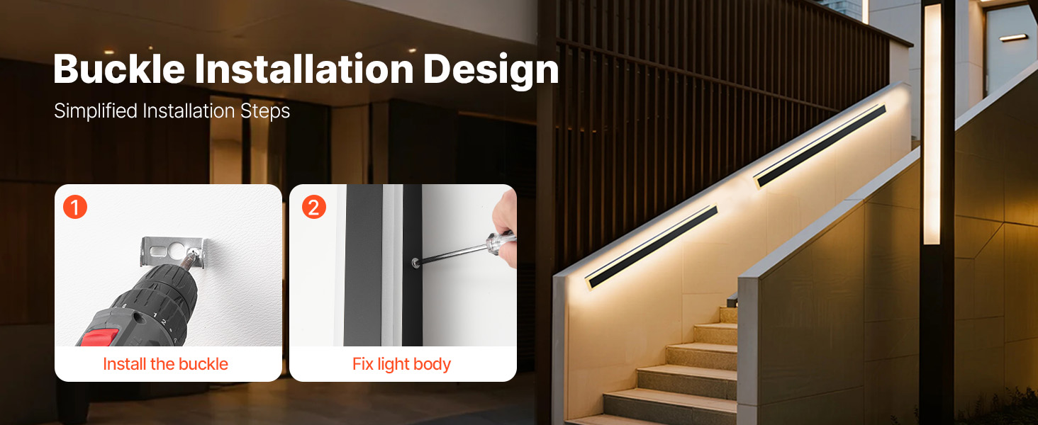Tento vonkajší nástenný svietnik je vybavený vopred vygravírovanými káblovými kanálmi a inštaláciou pomocou spony. Najprv usporiadajte kabeláž v kanáloch a potom upevnite telo svetla pomocou spony. Tento dvojkrokový postup zjednodušuje zložité operácie a je vhodný na rôzne vonkajšie inštalácie.