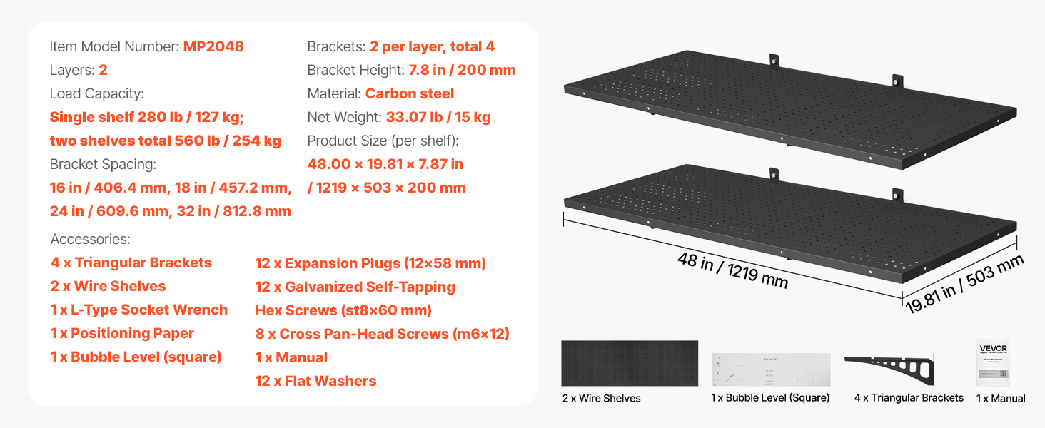 Táto sada garážových nástenných políc obsahuje dve police s rozmermi 1,64 x 4 ft s robustnou oceľovou konštrukciou. Každá polica unesie až 280 libier, s celkovou nosnosťou 560 libier pri rovnomernom rozložení hmotnosti – ideálne pre náradie, koše a objemné vybavenie.
