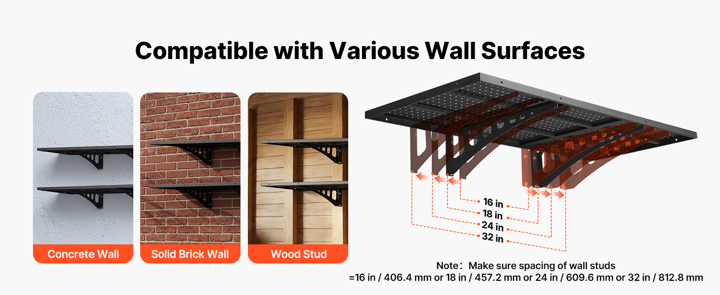 Tieto nástenné úložné police sa prispôsobujú rôznym usporiadaniam s nastaviteľným rozostupom konzol na 16, 18, 24 alebo 32 palcov. Bezpečne sa inštalujú na betónové steny, pevné tehlové steny alebo drevené stĺpiky, vďaka čomu sú vhodné pre širokú škálu priestorov.