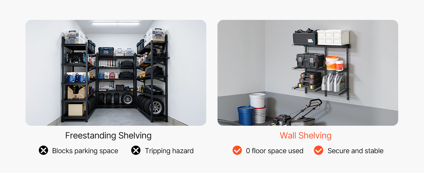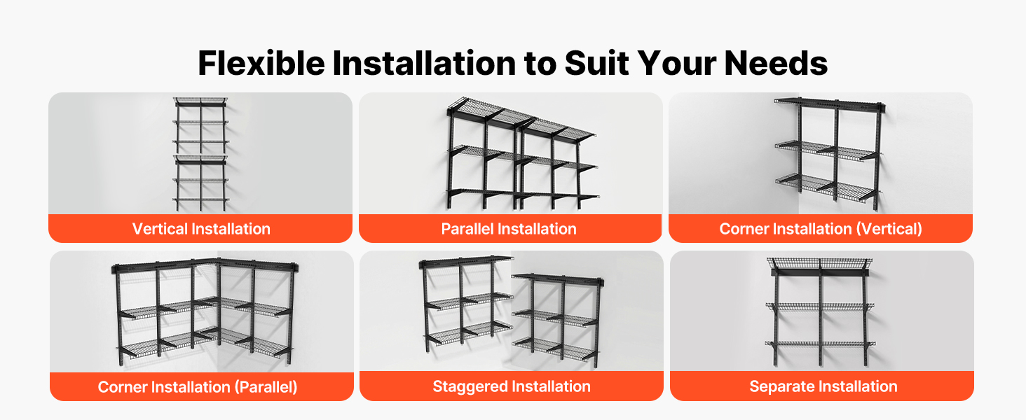 Tieto nástenné regály do garáže podporujú vertikálnu, paralelnú, rohovú, stupňovitú alebo jednopoliovú inštaláciu. Môžete si vybrať rozloženie, ktoré vyhovuje vašim potrebám skladovania, a maximálne využiť každú časť steny.