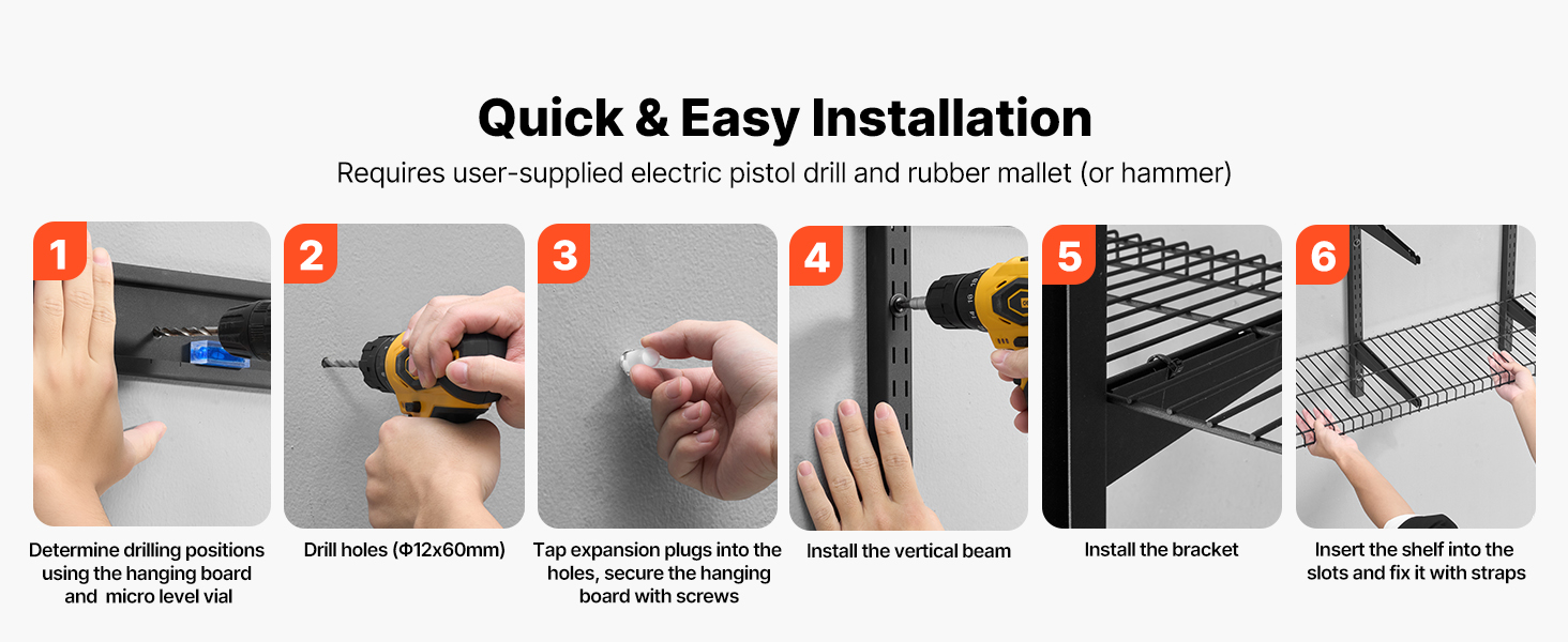 Balíček závesných regálov do garáže obsahuje závesné dosky a vodováhu, ktorá pomáha presne označiť body vŕtania. Jednoduché kroky inštalácie uľahčujú montáž aj pre začínajúcich inštalatérov.